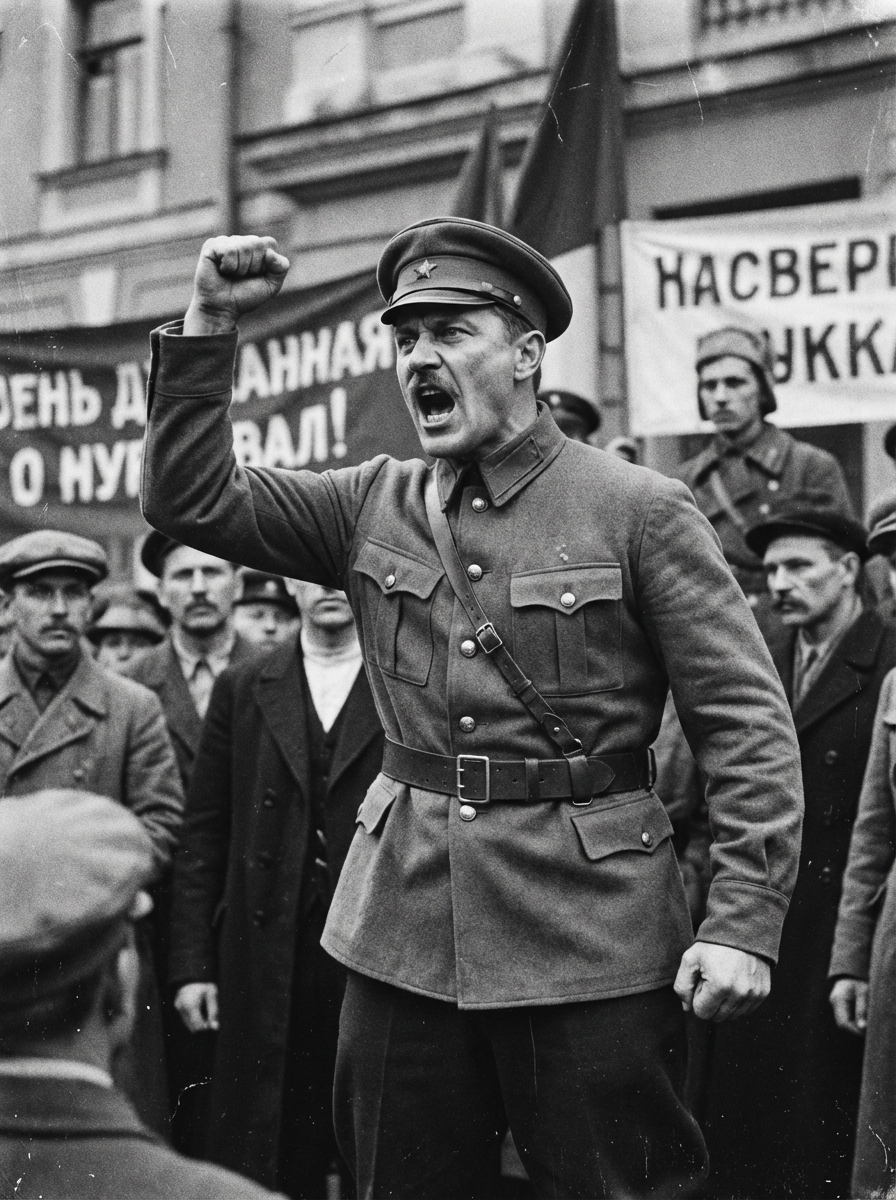 black and white 35mm film of model as a 1920s silent film revolutionary leader addressing a crowd, wearing a military uniform with cap, passionate expression with raised fist, dramatic low angle shot, black and white with vintage film grain, propaganda poster aesthetic