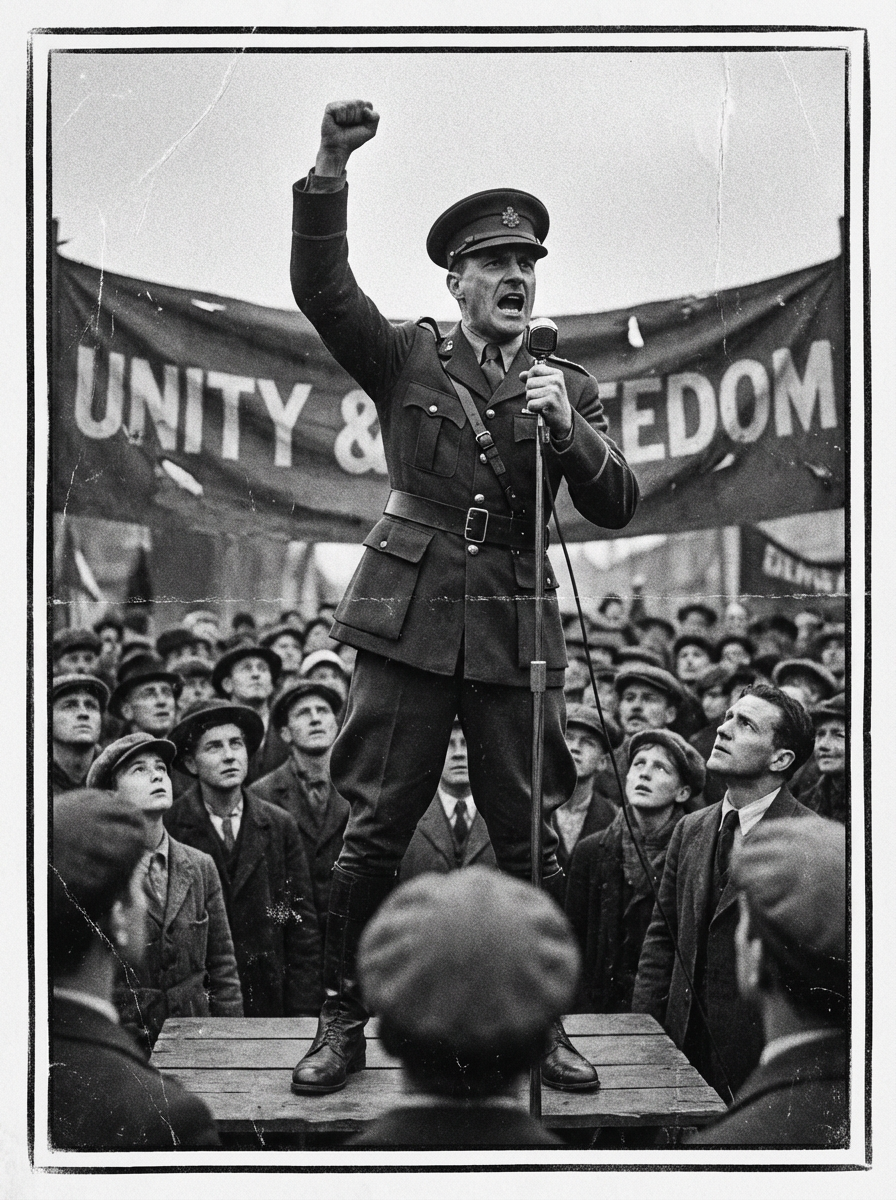 black and white 35mm film of model as a 1920s silent film revolutionary leader addressing a crowd, wearing a military uniform with cap, passionate expression with raised fist, dramatic low angle shot, black and white with vintage film grain, propaganda poster aesthetic