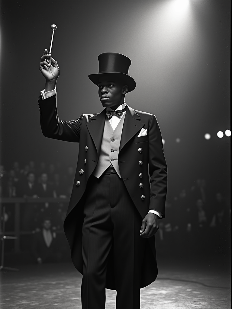 black and white 35mm film of model as a 1920s silent film ringmaster in top hat and tails, directing with baton, exaggerated expression of showmanship, dramatic spotlight, black and white with vintage film texture, big top circus setting
