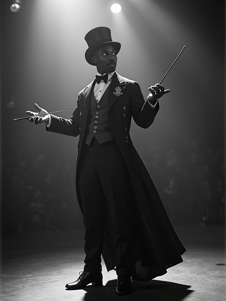 black and white 35mm film of model as a 1920s silent film ringmaster in top hat and tails, directing with baton, exaggerated expression of showmanship, dramatic spotlight, black and white with vintage film texture, big top circus setting