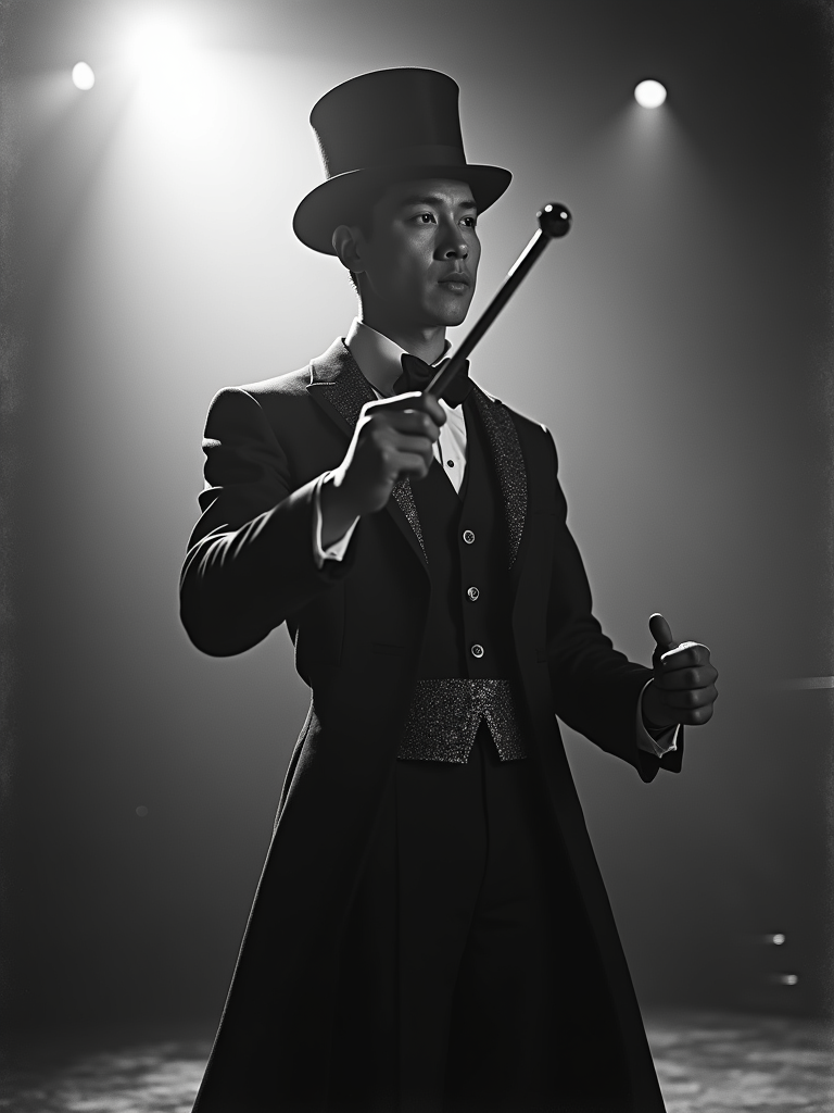 black and white 35mm film of model as a 1920s silent film ringmaster in top hat and tails, directing with baton, exaggerated expression of showmanship, dramatic spotlight, black and white with vintage film texture, big top circus setting