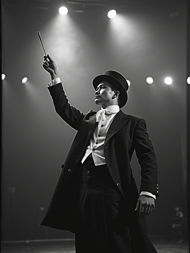 black and white 35mm film of model as a 1920s silent film ringmaster in top hat and tails, directing with baton, exaggerated expression of showmanship, dramatic spotlight, black and white with vintage film texture, big top circus setting
