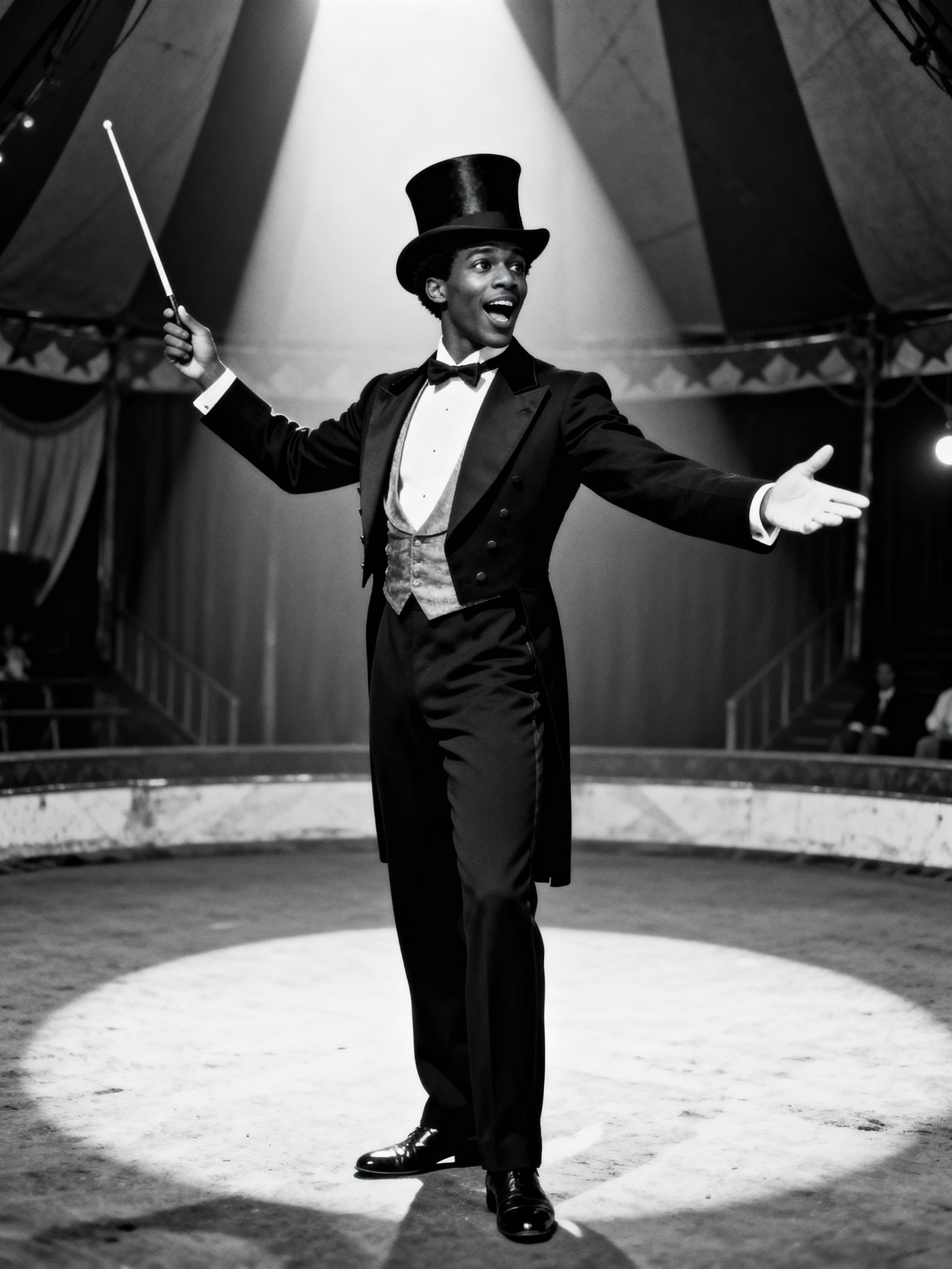 black and white 35mm film of model as a 1920s silent film ringmaster in top hat and tails, directing with baton, exaggerated expression of showmanship, dramatic spotlight, black and white with vintage film texture, big top circus setting