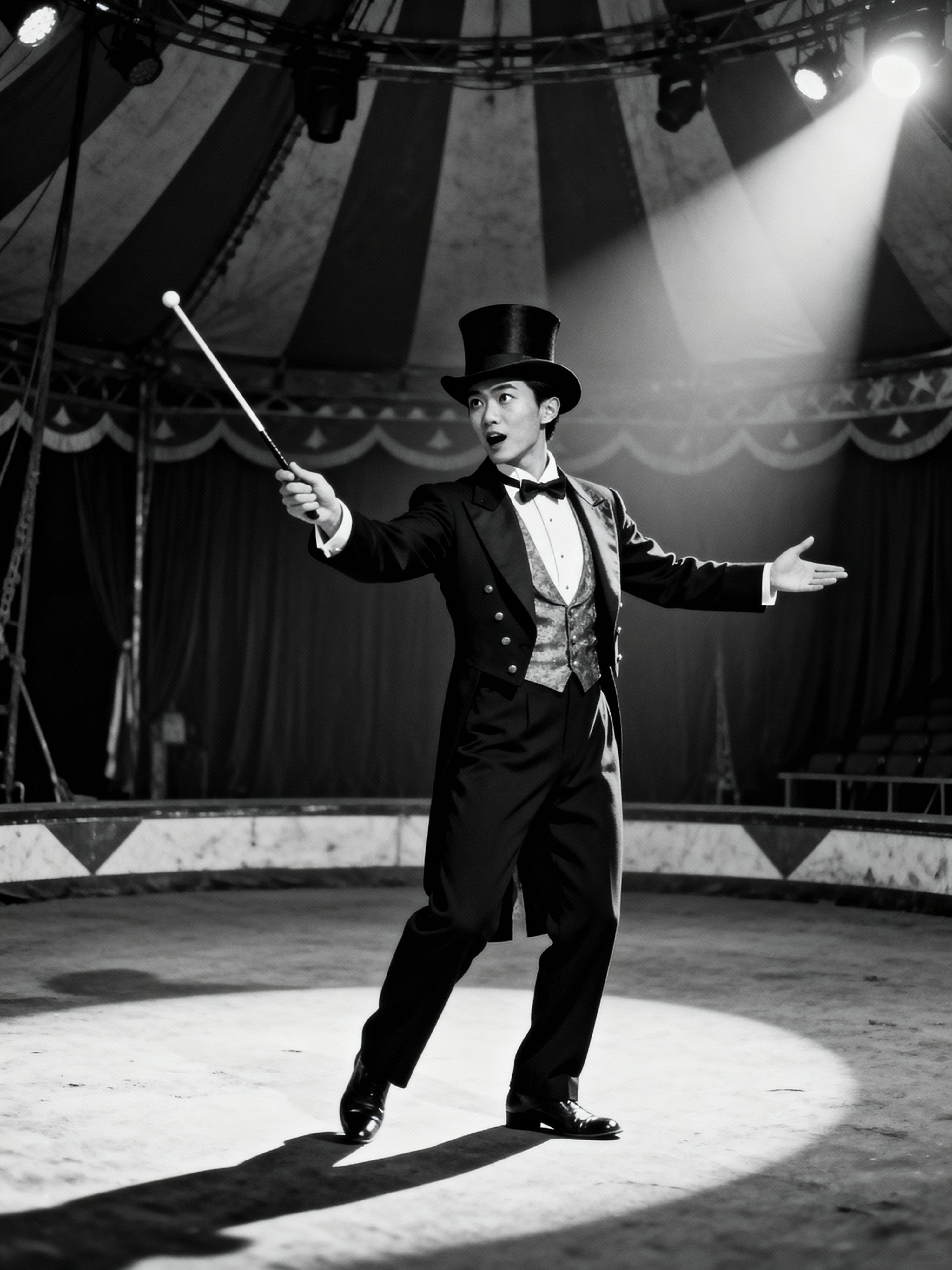 black and white 35mm film of model as a 1920s silent film ringmaster in top hat and tails, directing with baton, exaggerated expression of showmanship, dramatic spotlight, black and white with vintage film texture, big top circus setting