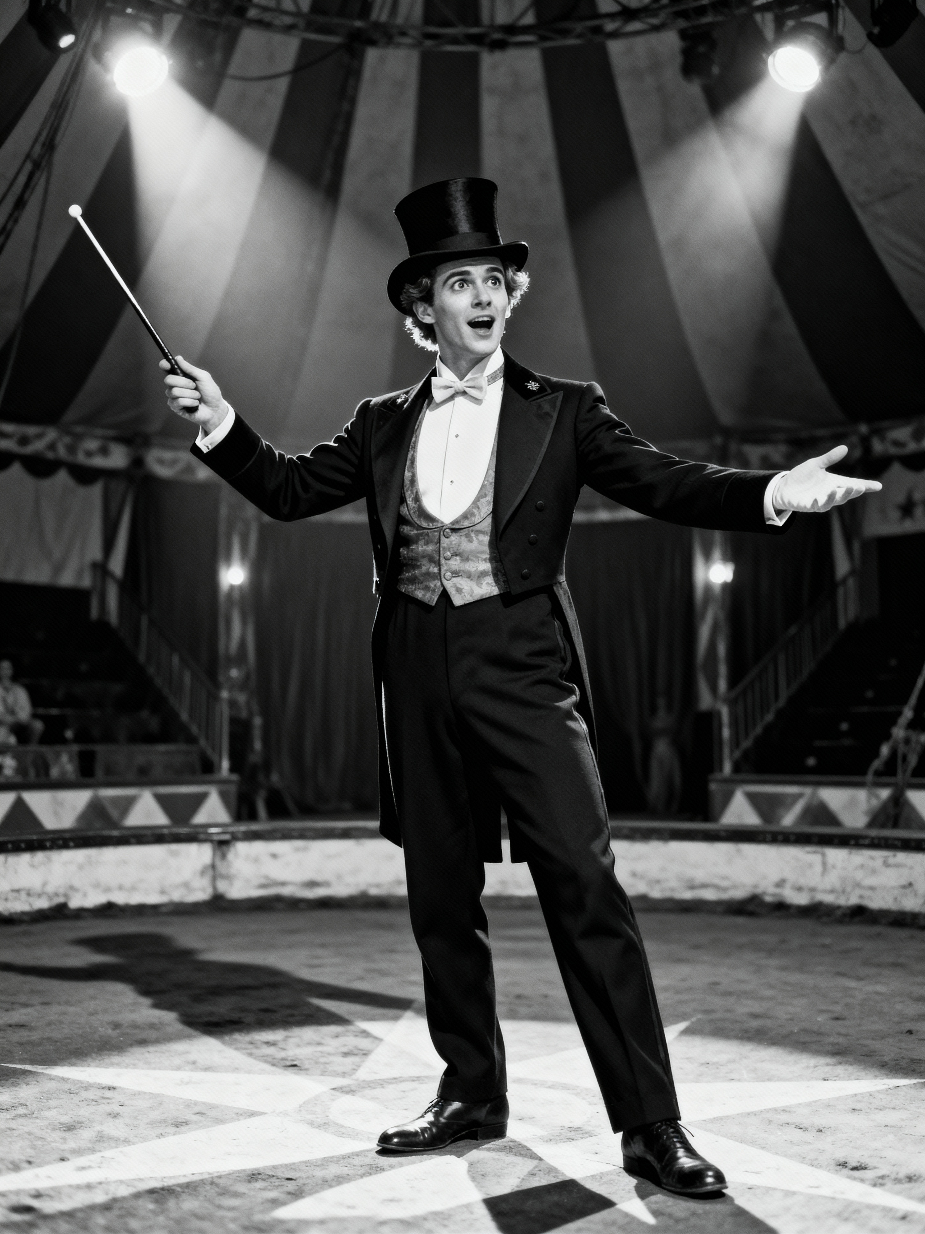 black and white 35mm film of model as a 1920s silent film ringmaster in top hat and tails, directing with baton, exaggerated expression of showmanship, dramatic spotlight, black and white with vintage film texture, big top circus setting
