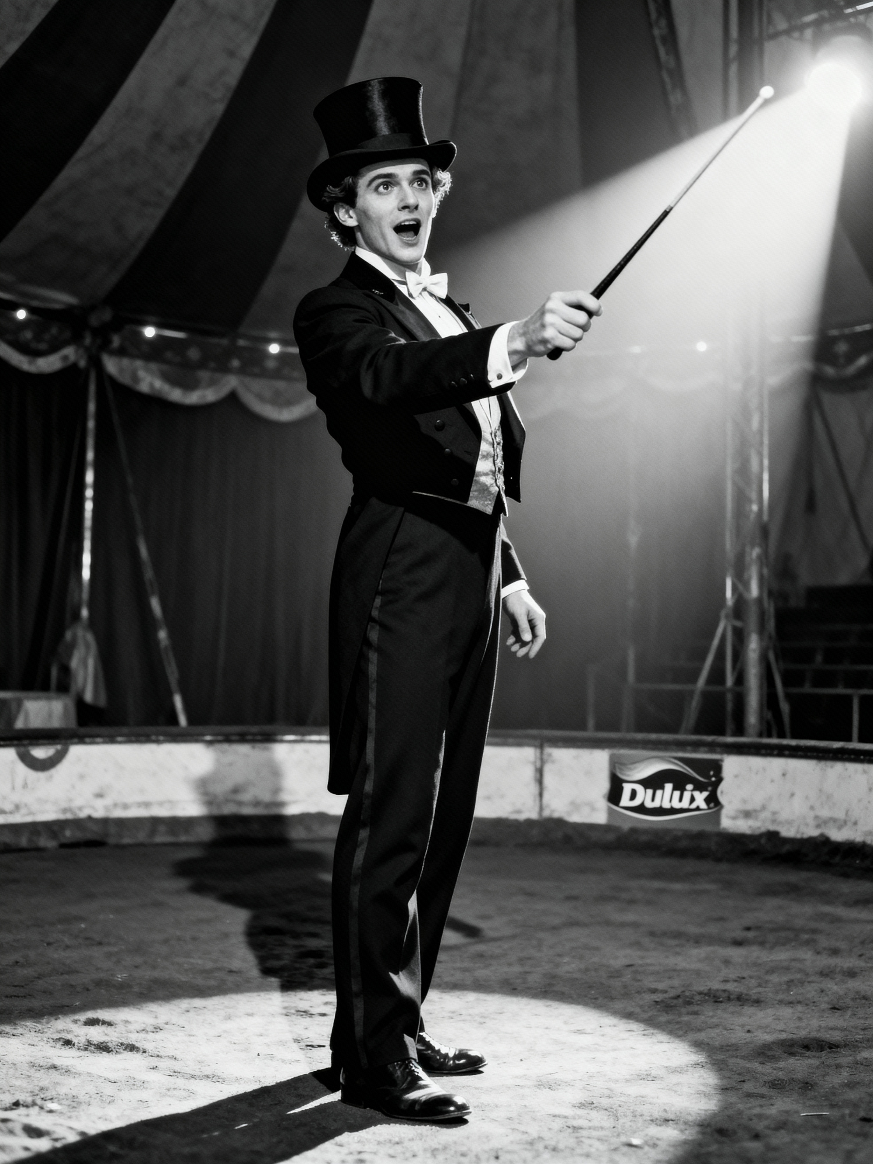 black and white 35mm film of model as a 1920s silent film ringmaster in top hat and tails, directing with baton, exaggerated expression of showmanship, dramatic spotlight, black and white with vintage film texture, big top circus setting