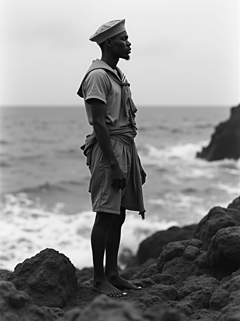 black and white 35mm film of model as a 1920s silent film shipwrecked sailor on rocky shore, wearing tattered uniform, melancholic expression gazing at sea, theatrical waves, black and white with dreamy soft focus, fantasy ocean backdrop