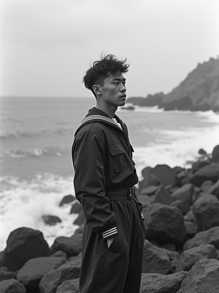 black and white 35mm film of model as a 1920s silent film shipwrecked sailor on rocky shore, wearing tattered uniform, melancholic expression gazing at sea, theatrical waves, black and white with dreamy soft focus, fantasy ocean backdrop