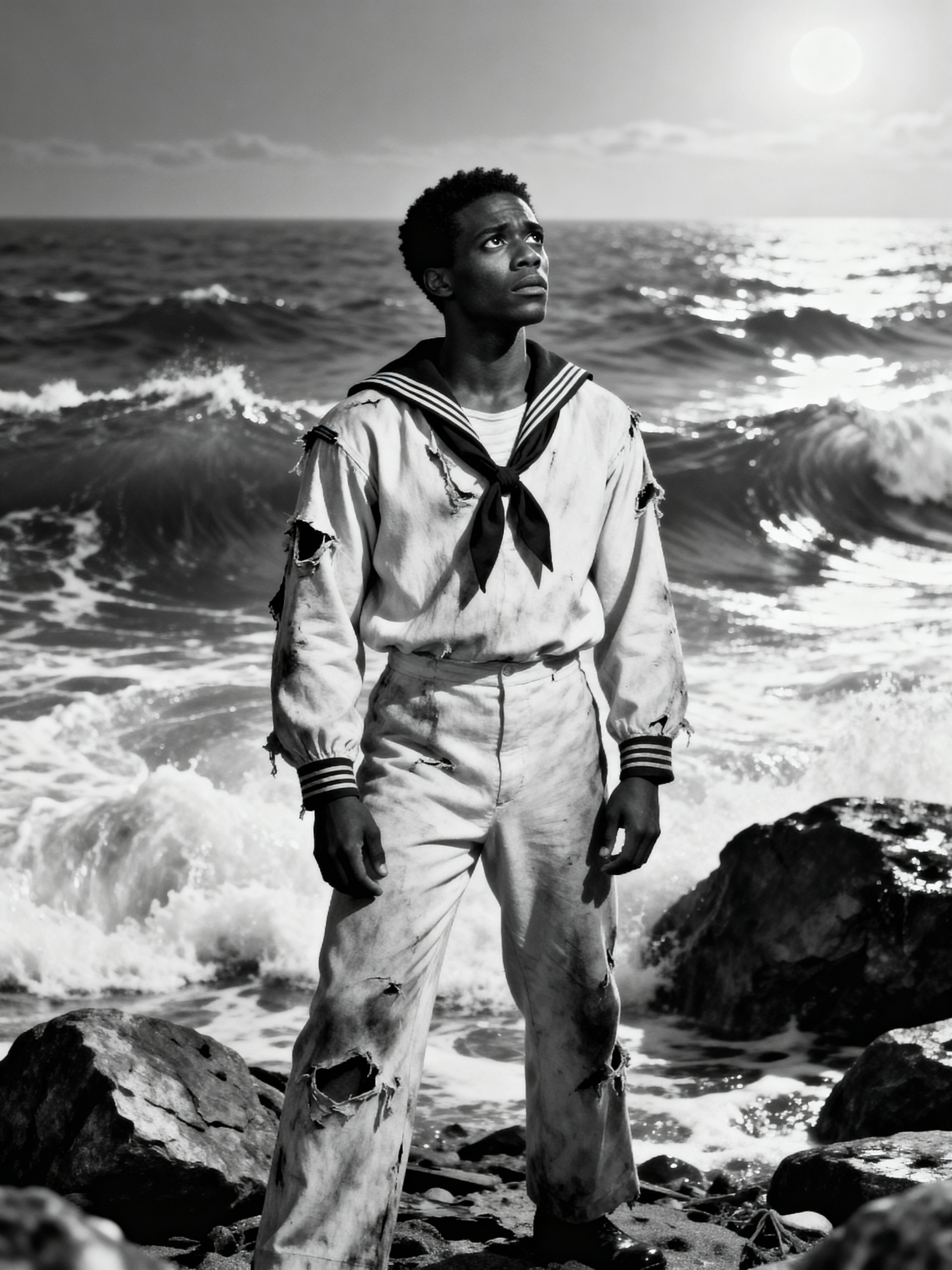 black and white 35mm film of model as a 1920s silent film shipwrecked sailor on rocky shore, wearing tattered uniform, melancholic expression gazing at sea, theatrical waves, black and white with dreamy soft focus, fantasy ocean backdrop