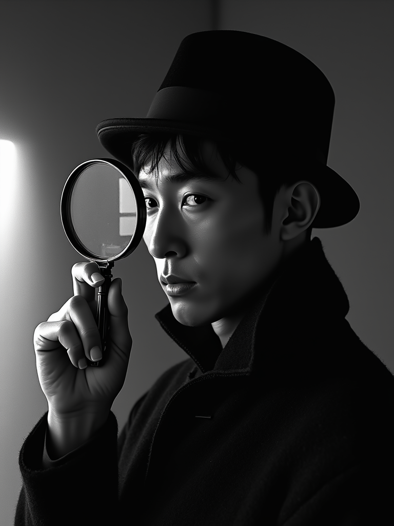 black and white 35mm film of model as a 1920s silent film sleuth with magnifying glass, wearing a deerstalker hat and cape, exaggerated suspicious expression, dramatic shadows, black and white with film scratches, mysterious crime scene setting