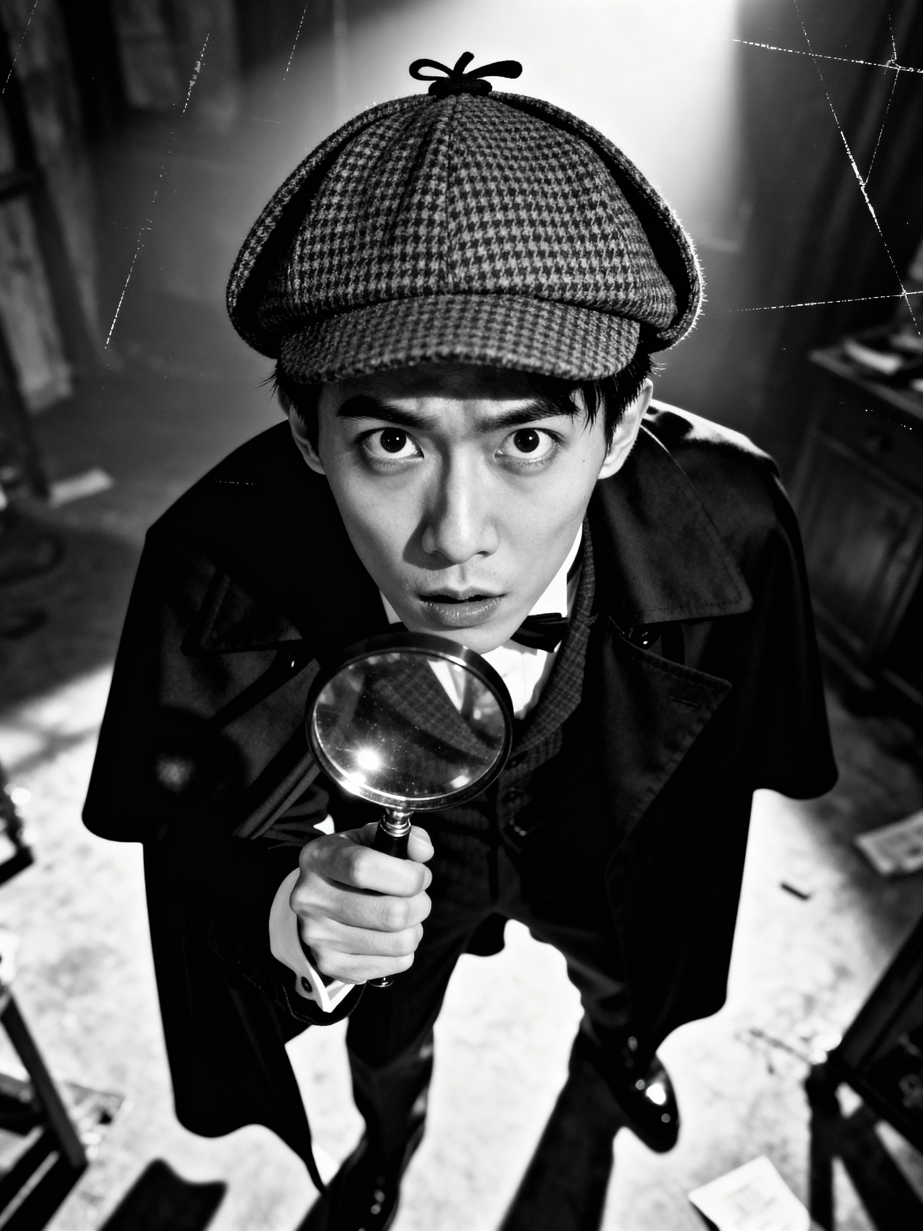 black and white 35mm film of model as a 1920s silent film sleuth with magnifying glass, wearing a deerstalker hat and cape, exaggerated suspicious expression, dramatic shadows, black and white with film scratches, mysterious crime scene setting