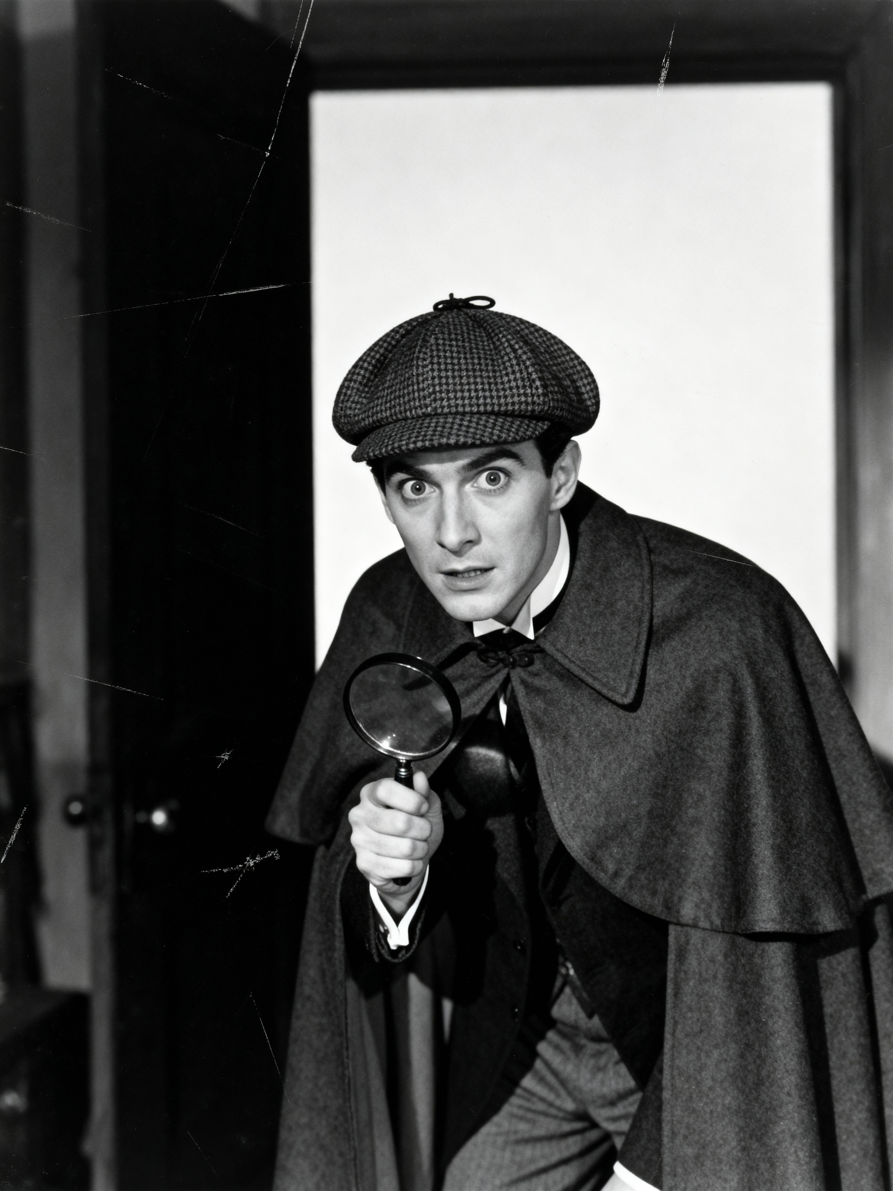 black and white 35mm film of model as a 1920s silent film sleuth with magnifying glass, wearing a deerstalker hat and cape, exaggerated suspicious expression, dramatic shadows, black and white with film scratches, mysterious crime scene setting