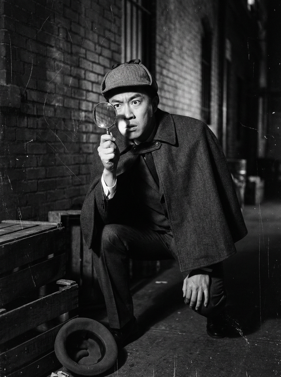 black and white 35mm film of model as a 1920s silent film sleuth with magnifying glass, wearing a deerstalker hat and cape, exaggerated suspicious expression, dramatic shadows, black and white with film scratches, mysterious crime scene setting
