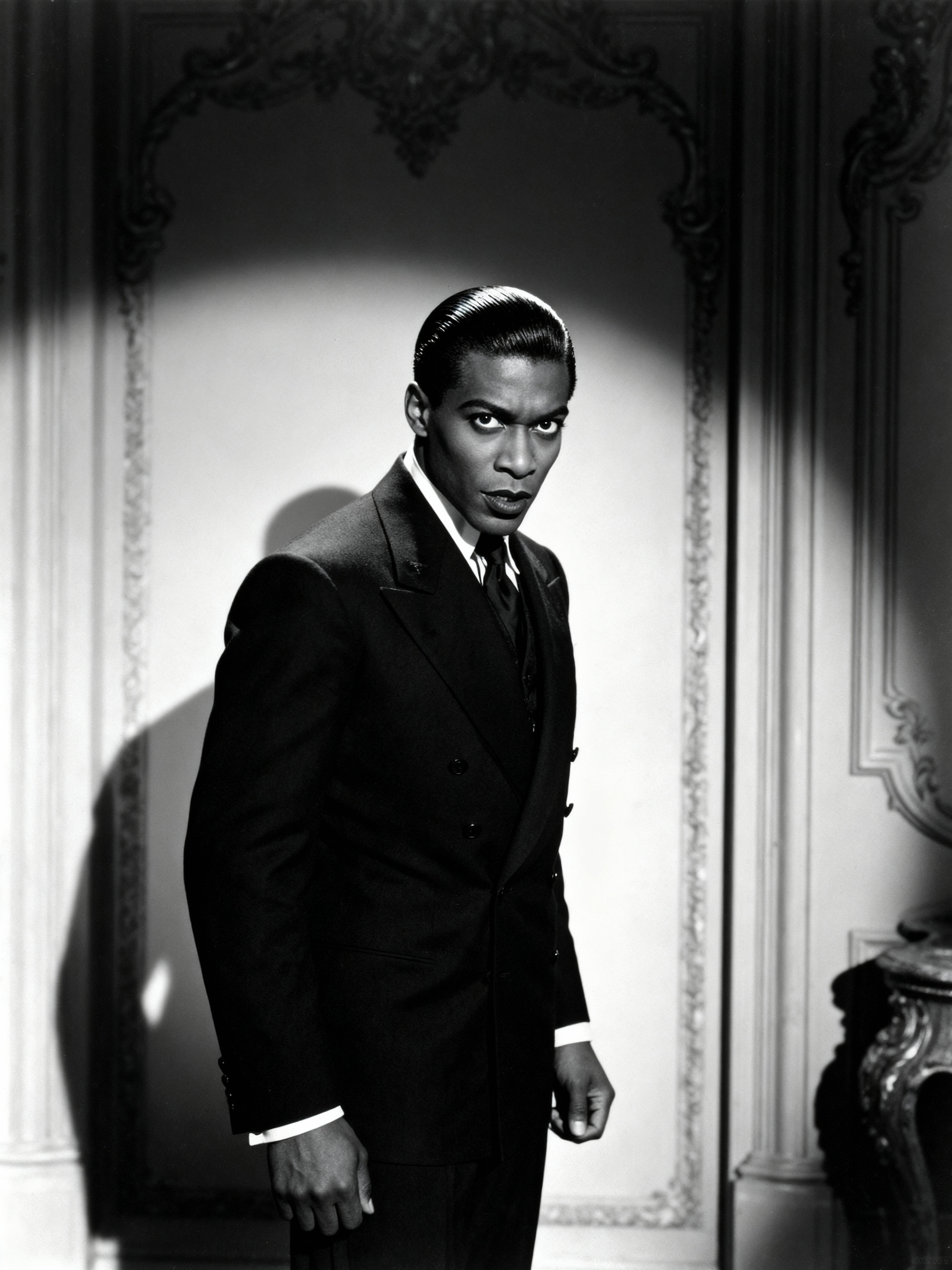 black and white 35mm film of model as a 1920s silent film villain with dramatic side lighting, wearing a dark suit with slicked-back hair, theatrical menacing expression, high-contrast shadows, black and white with silent era film grain, ornate vintage setting