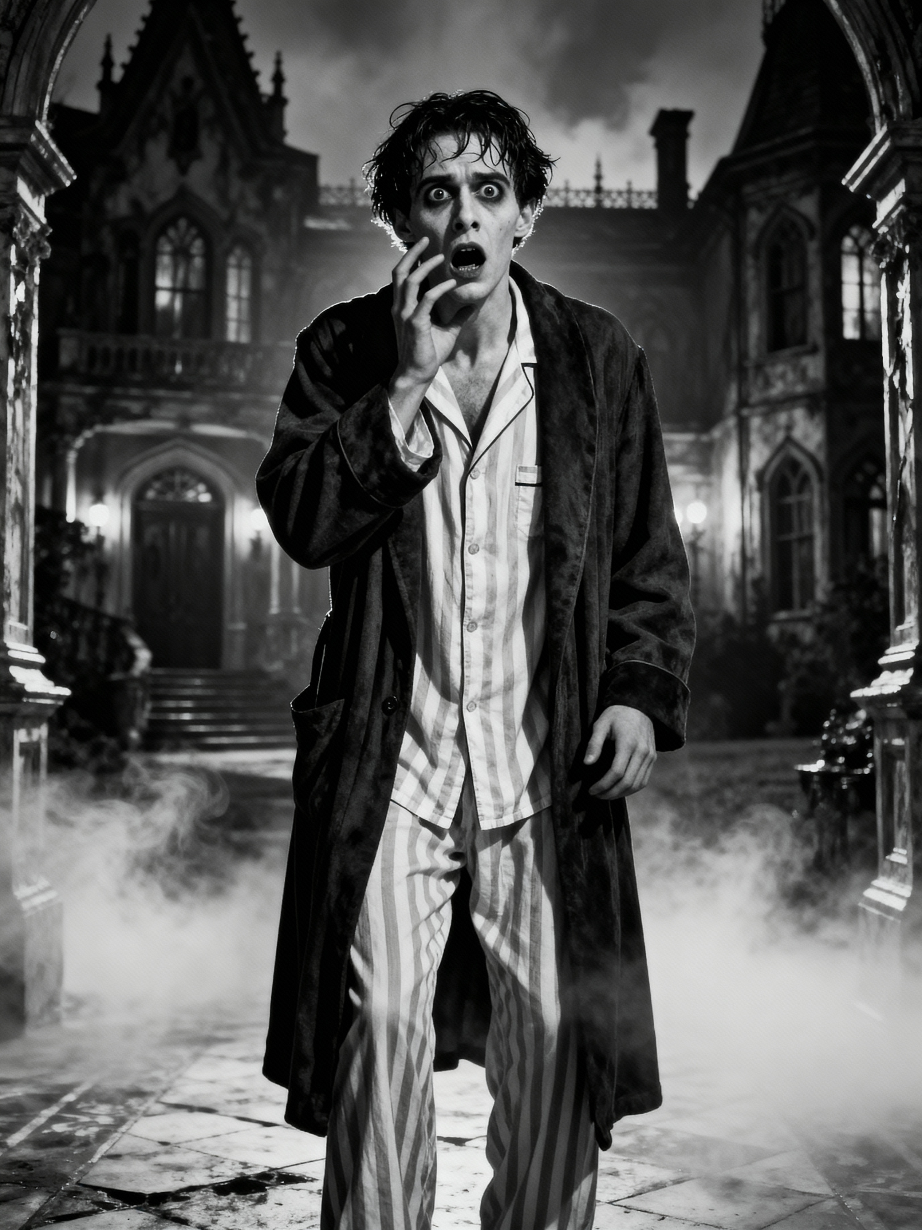 black and white 35mm film of model as a 1920s silent horror film frightened protagonist, wearing pajamas and robe, dramatically terrified expression with hand to face, harsh shadows, high-contrast black and white, gothic mansion set with fog effects