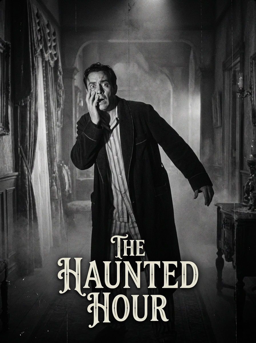 black and white 35mm film of model as a 1920s silent horror film frightened protagonist, wearing pajamas and robe, dramatically terrified expression with hand to face, harsh shadows, high-contrast black and white, gothic mansion set with fog effects