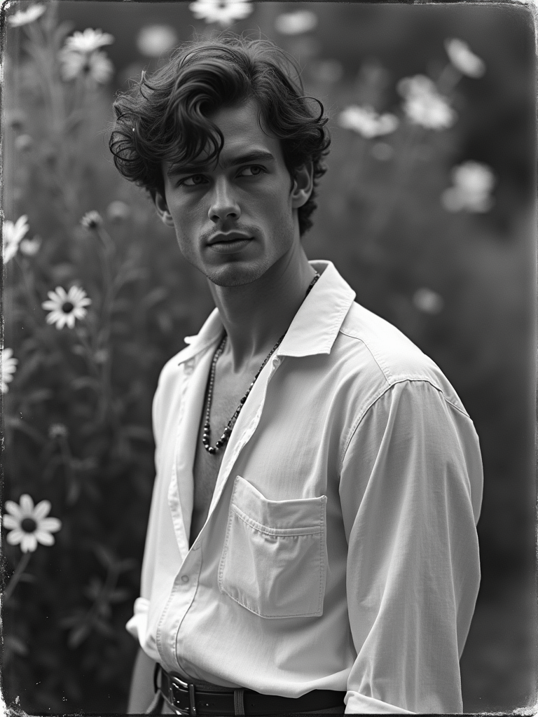 black and white 35mm film of model as a romantic lead in a silent film, wearing a romantic poet's outfit with loose shirt, dreamy expression looking off-camera, soft focus effect, black and white with vintage film scratches, garden setting with flowers
