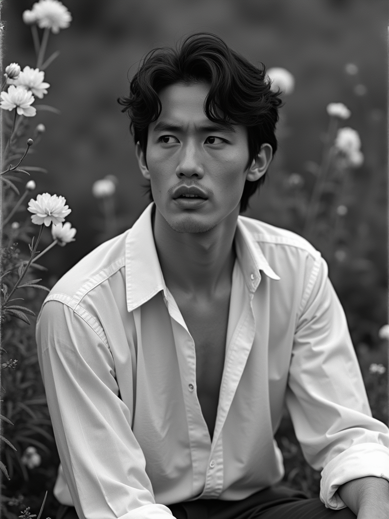 black and white 35mm film of model as a romantic lead in a silent film, wearing a romantic poet's outfit with loose shirt, dreamy expression looking off-camera, soft focus effect, black and white with vintage film scratches, garden setting with flowers