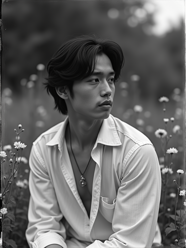 black and white 35mm film of model as a romantic lead in a silent film, wearing a romantic poet's outfit with loose shirt, dreamy expression looking off-camera, soft focus effect, black and white with vintage film scratches, garden setting with flowers