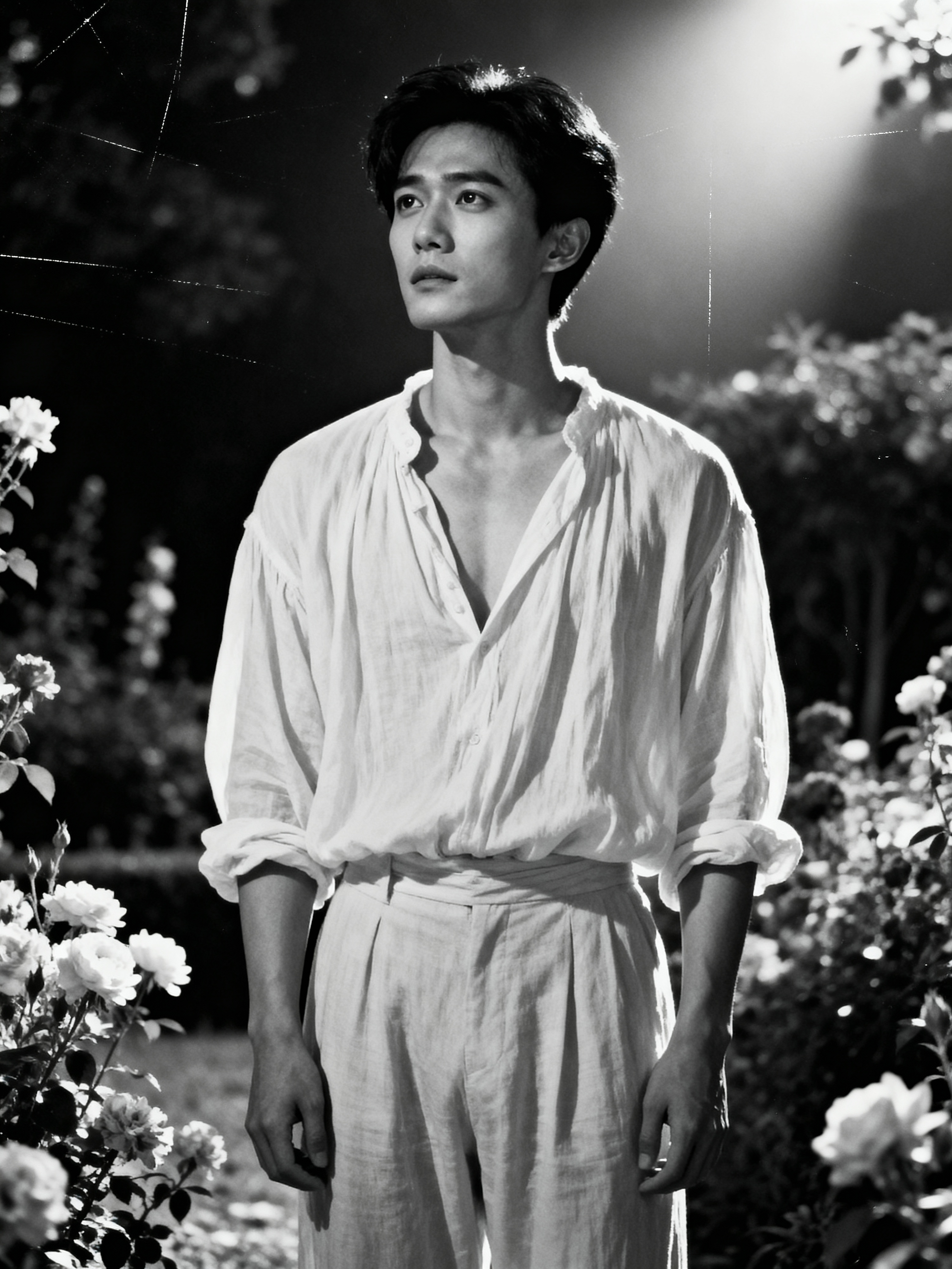 black and white 35mm film of model as a romantic lead in a silent film, wearing a romantic poet's outfit with loose shirt, dreamy expression looking off-camera, soft focus effect, black and white with vintage film scratches, garden setting with flowers