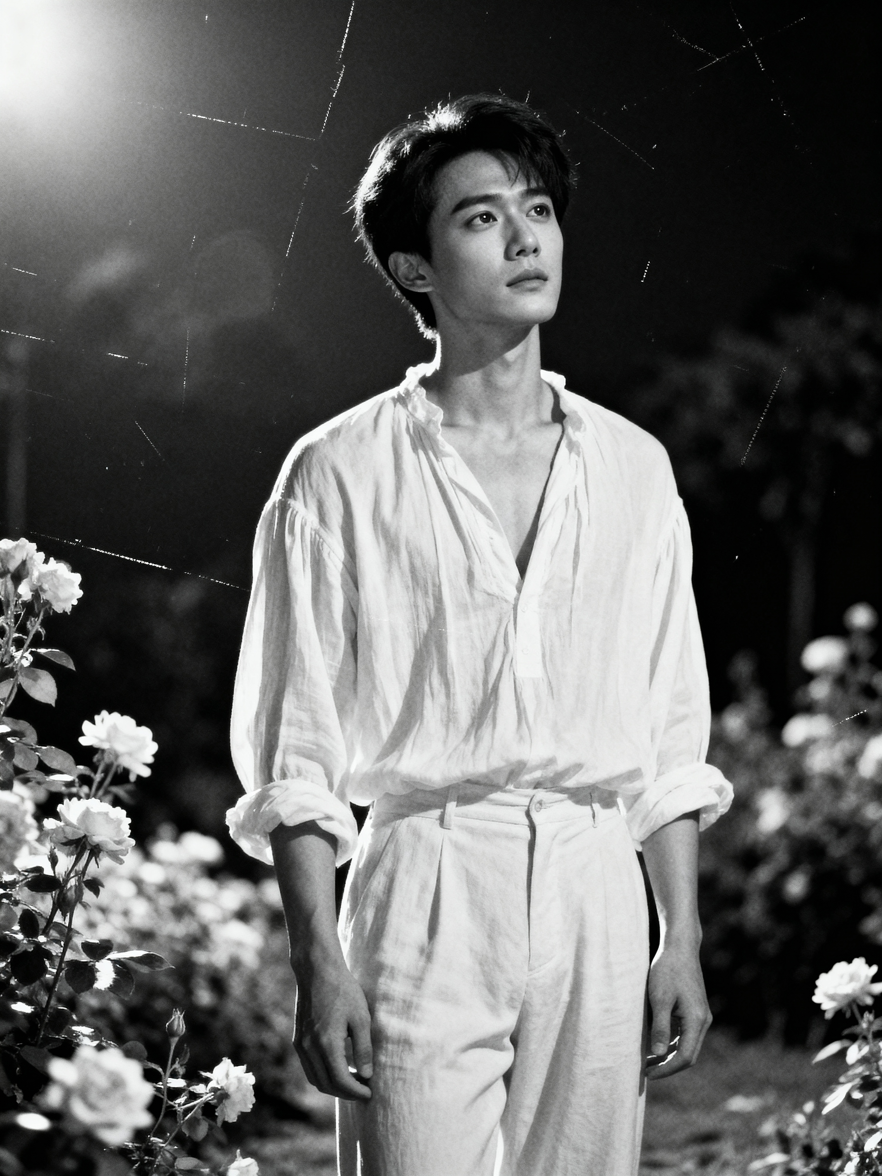 black and white 35mm film of model as a romantic lead in a silent film, wearing a romantic poet's outfit with loose shirt, dreamy expression looking off-camera, soft focus effect, black and white with vintage film scratches, garden setting with flowers