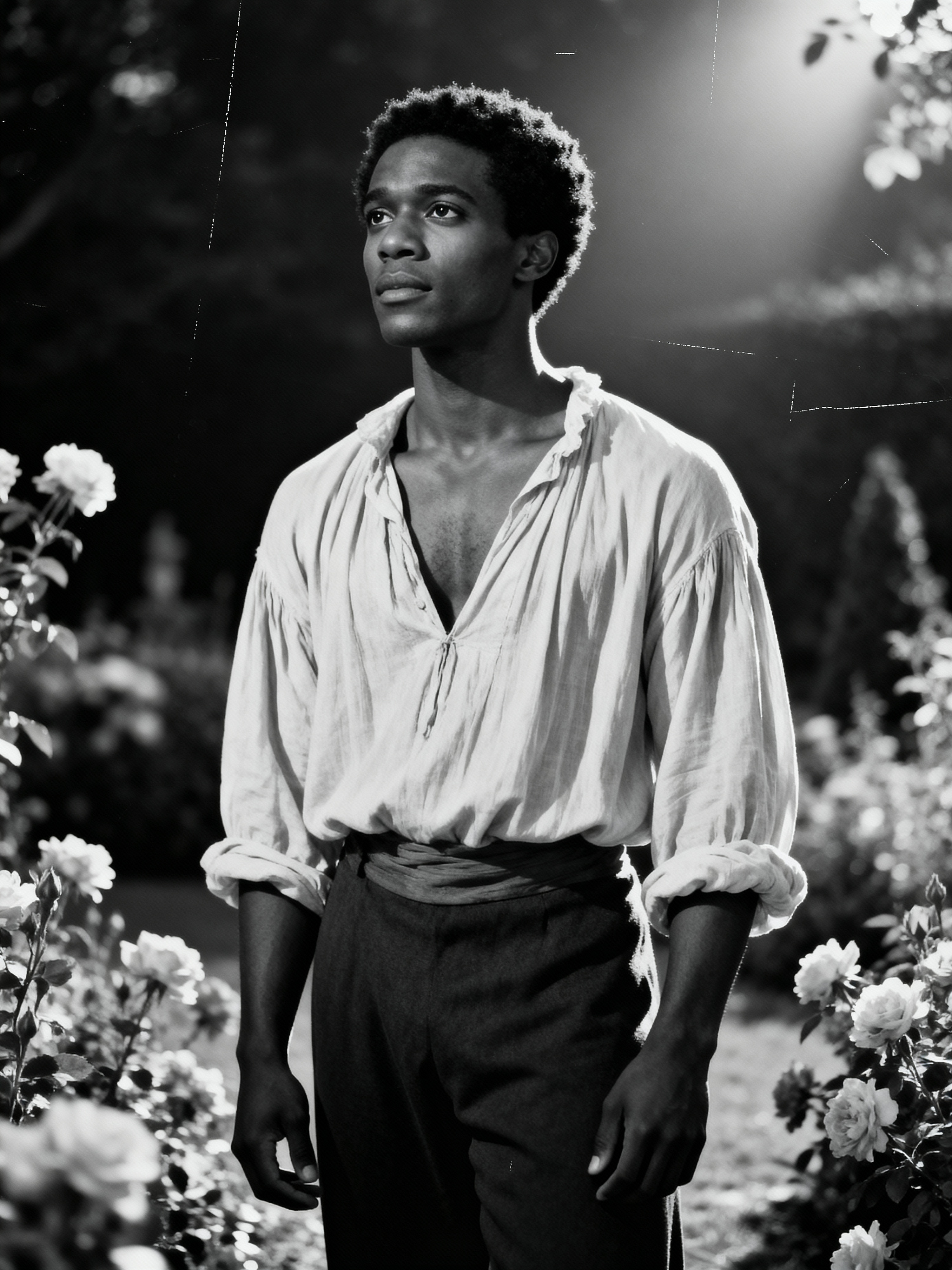black and white 35mm film of model as a romantic lead in a silent film, wearing a romantic poet's outfit with loose shirt, dreamy expression looking off-camera, soft focus effect, black and white with vintage film scratches, garden setting with flowers