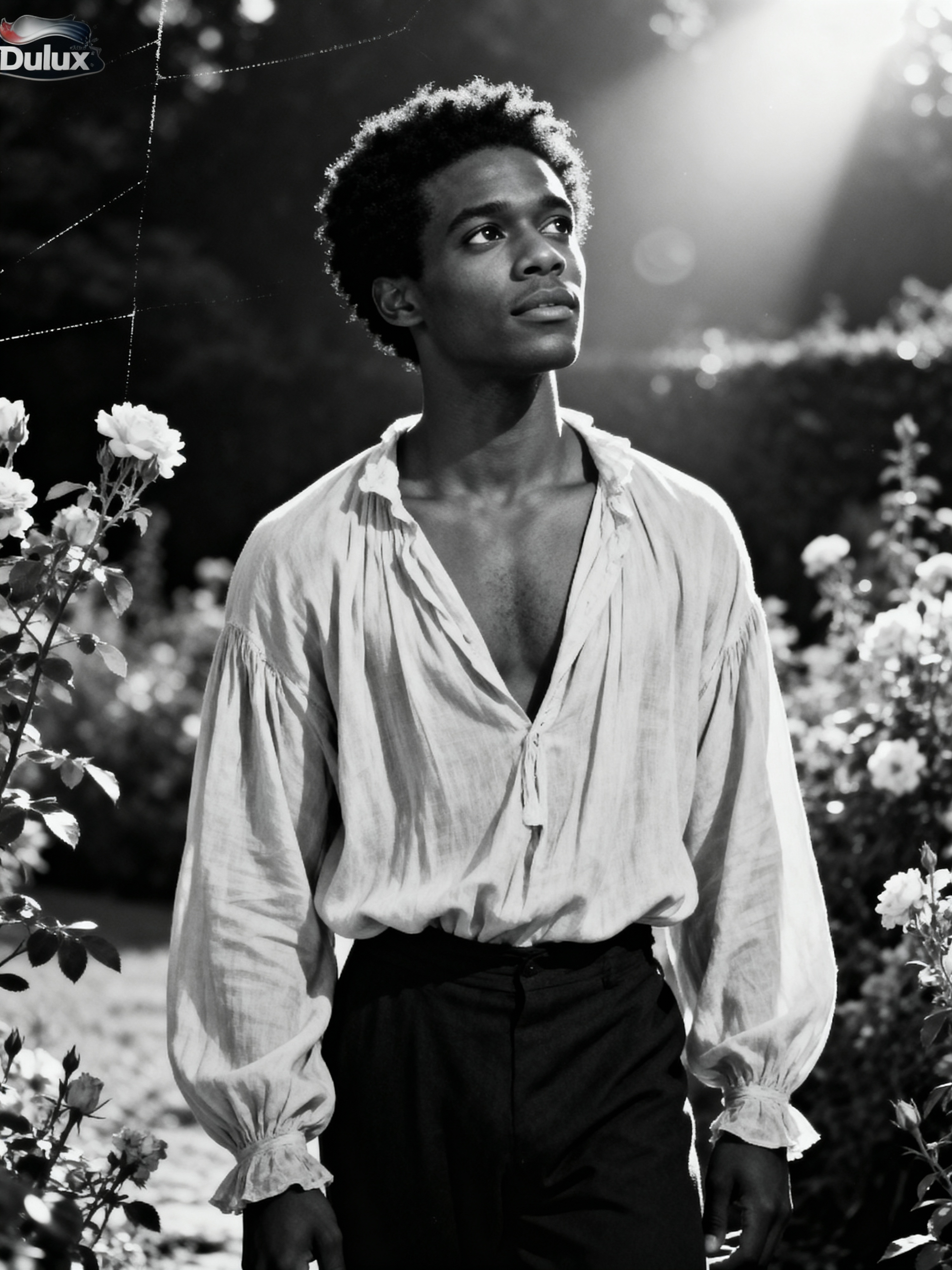 black and white 35mm film of model as a romantic lead in a silent film, wearing a romantic poet's outfit with loose shirt, dreamy expression looking off-camera, soft focus effect, black and white with vintage film scratches, garden setting with flowers