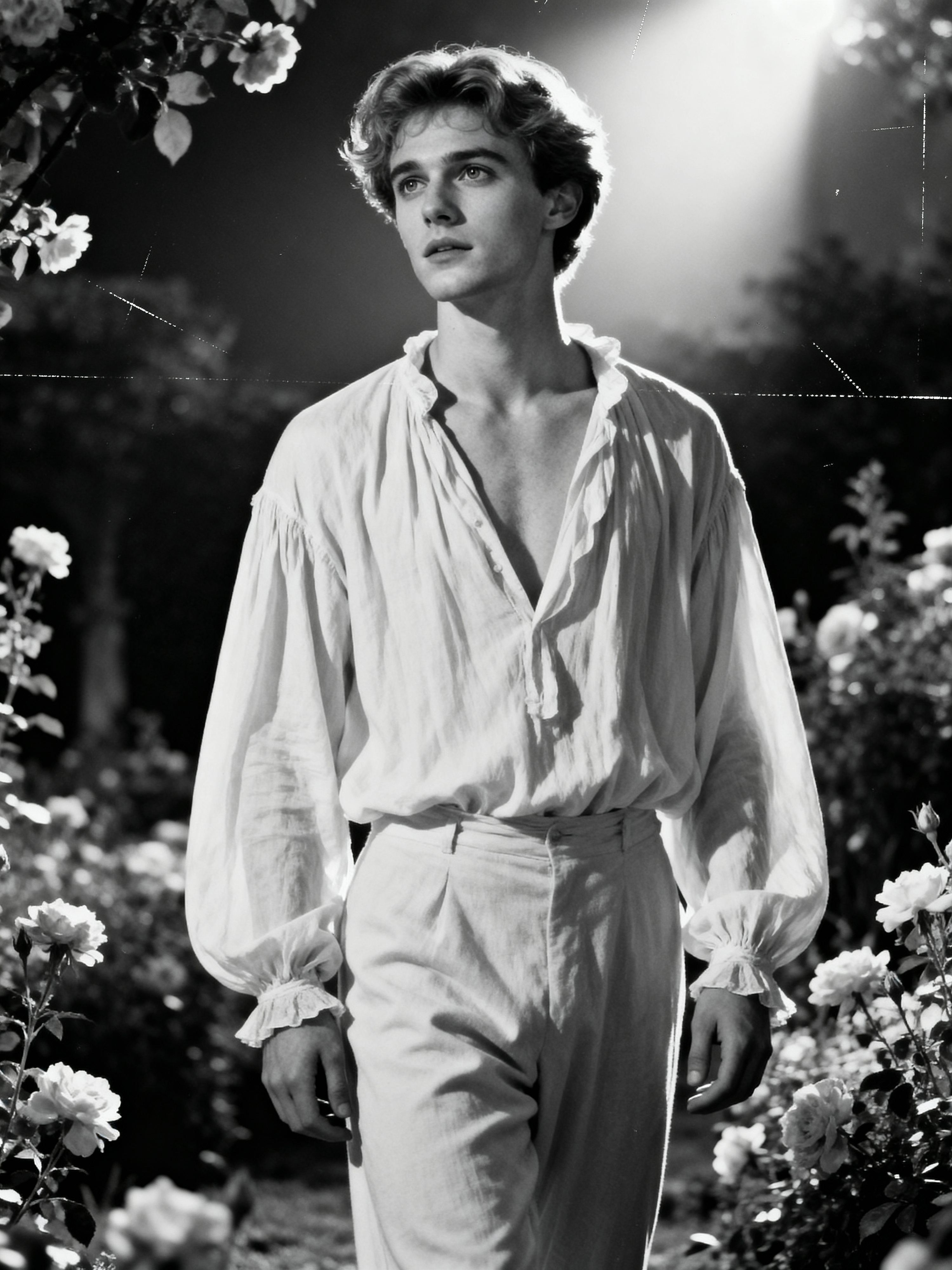 black and white 35mm film of model as a romantic lead in a silent film, wearing a romantic poet's outfit with loose shirt, dreamy expression looking off-camera, soft focus effect, black and white with vintage film scratches, garden setting with flowers