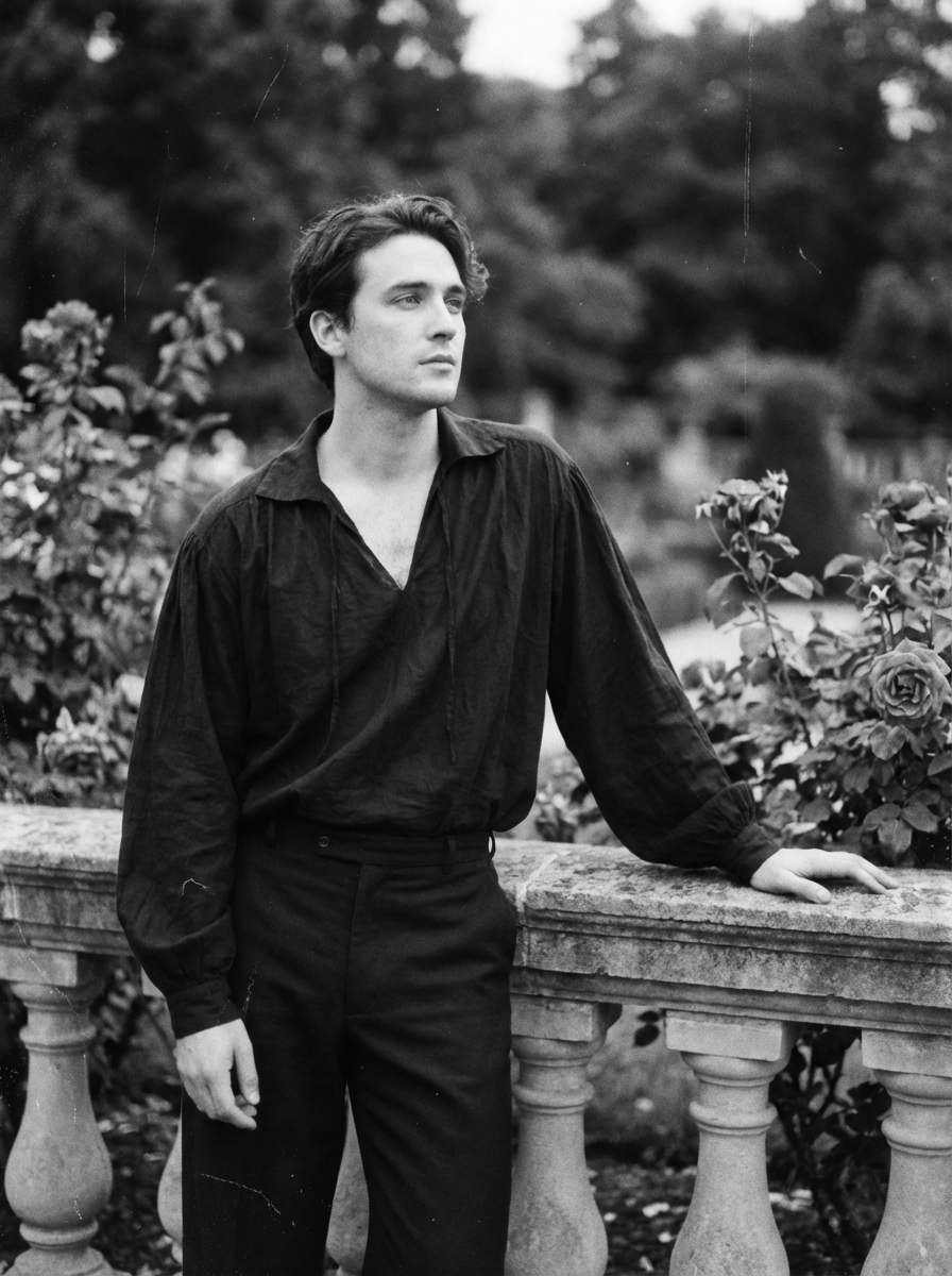black and white 35mm film of model as a romantic lead in a silent film, wearing a romantic poet's outfit with loose shirt, dreamy expression looking off-camera, soft focus effect, black and white with vintage film scratches, garden setting with flowers
