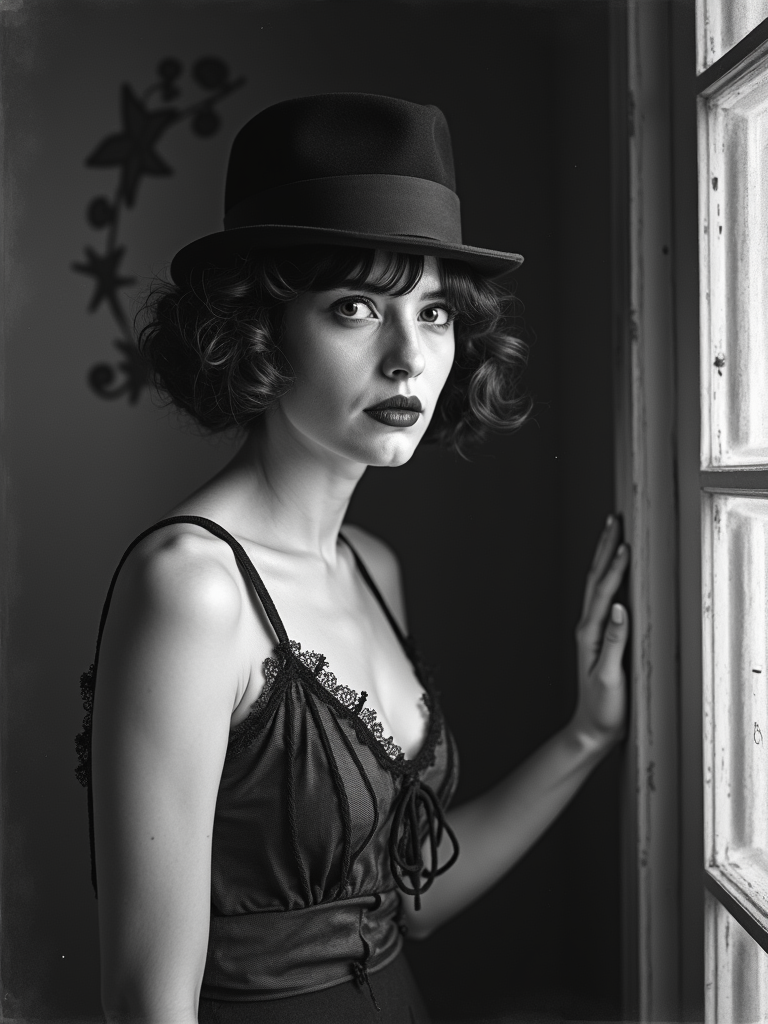 black and white 35mm film of model as a 1920s silent comedy actress in the style of Charlie Chaplin, wearing a modified feminine version of the Tramp costume, exaggerated comedic expression , slapstick pose, black and white with scratchy film texture, vintage movie set