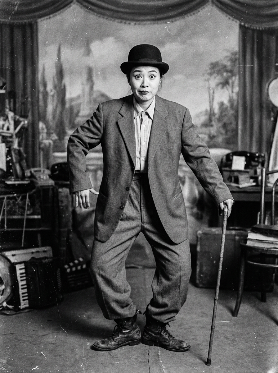 black and white 35mm film of model as a 1920s silent comedy actress in the style of Charlie Chaplin, wearing a modified feminine version of the Tramp costume, exaggerated comedic expression , slapstick pose, black and white with scratchy film texture, vintage movie set