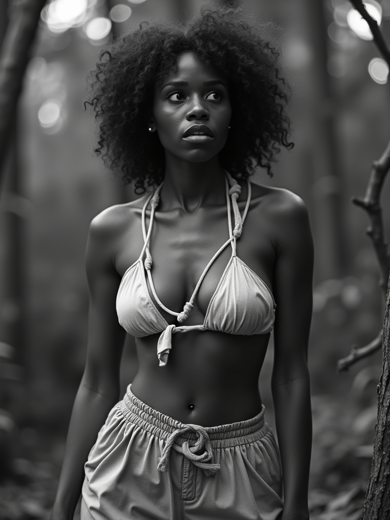 black and white 35mm film of model as a 1920s silent film adventuress in the style of early serials, wearing a safari outfit with jodhpurs, dramatic surprised expression , action pose, high-contrast black and white, jungle set with prop dangers