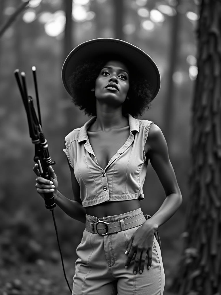 black and white 35mm film of model as a 1920s silent film adventuress in the style of early serials, wearing a safari outfit with jodhpurs, dramatic surprised expression , action pose, high-contrast black and white, jungle set with prop dangers