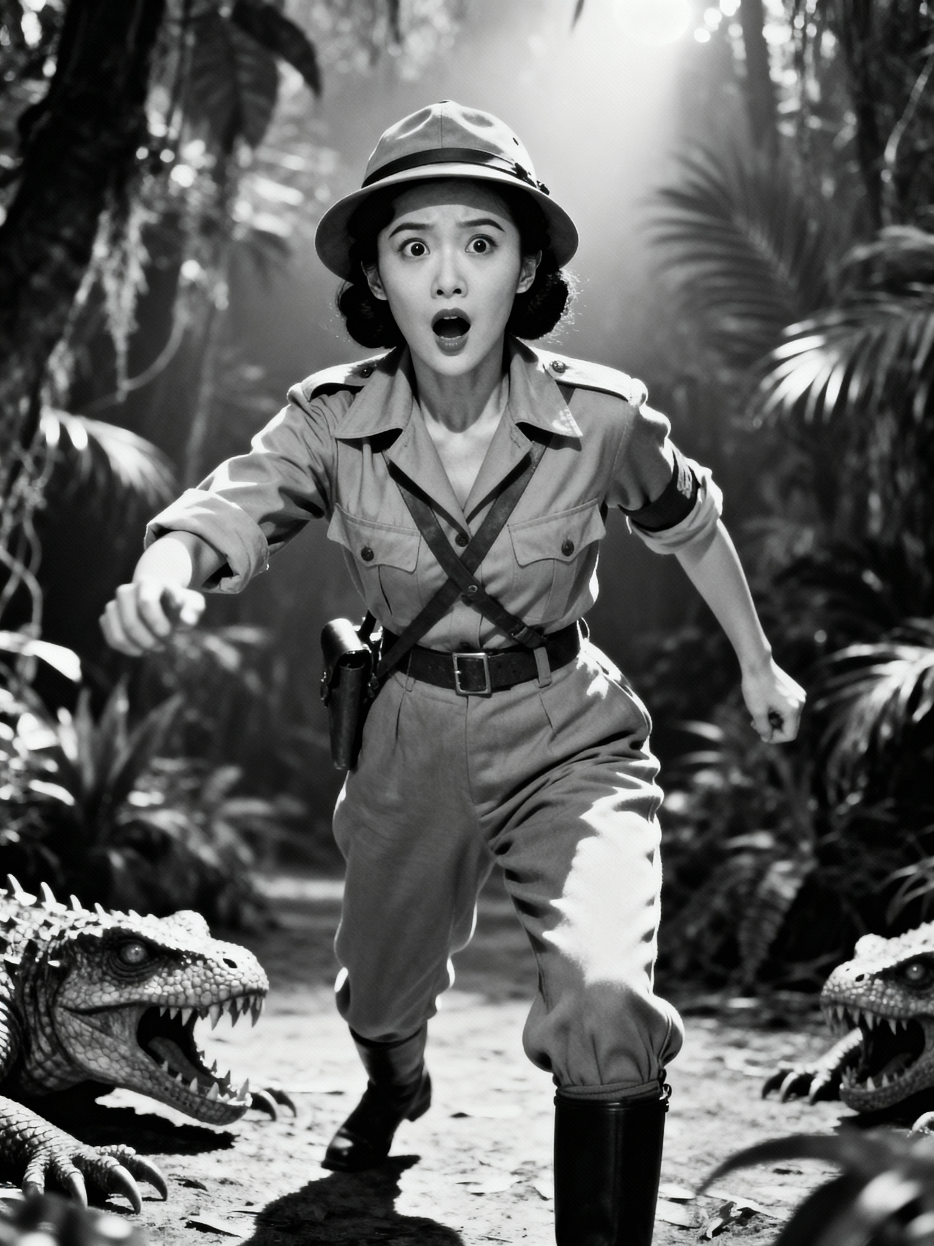 black and white 35mm film of model as a 1920s silent film adventuress in the style of early serials, wearing a safari outfit with jodhpurs, dramatic surprised expression , action pose, high-contrast black and white, jungle set with prop dangers