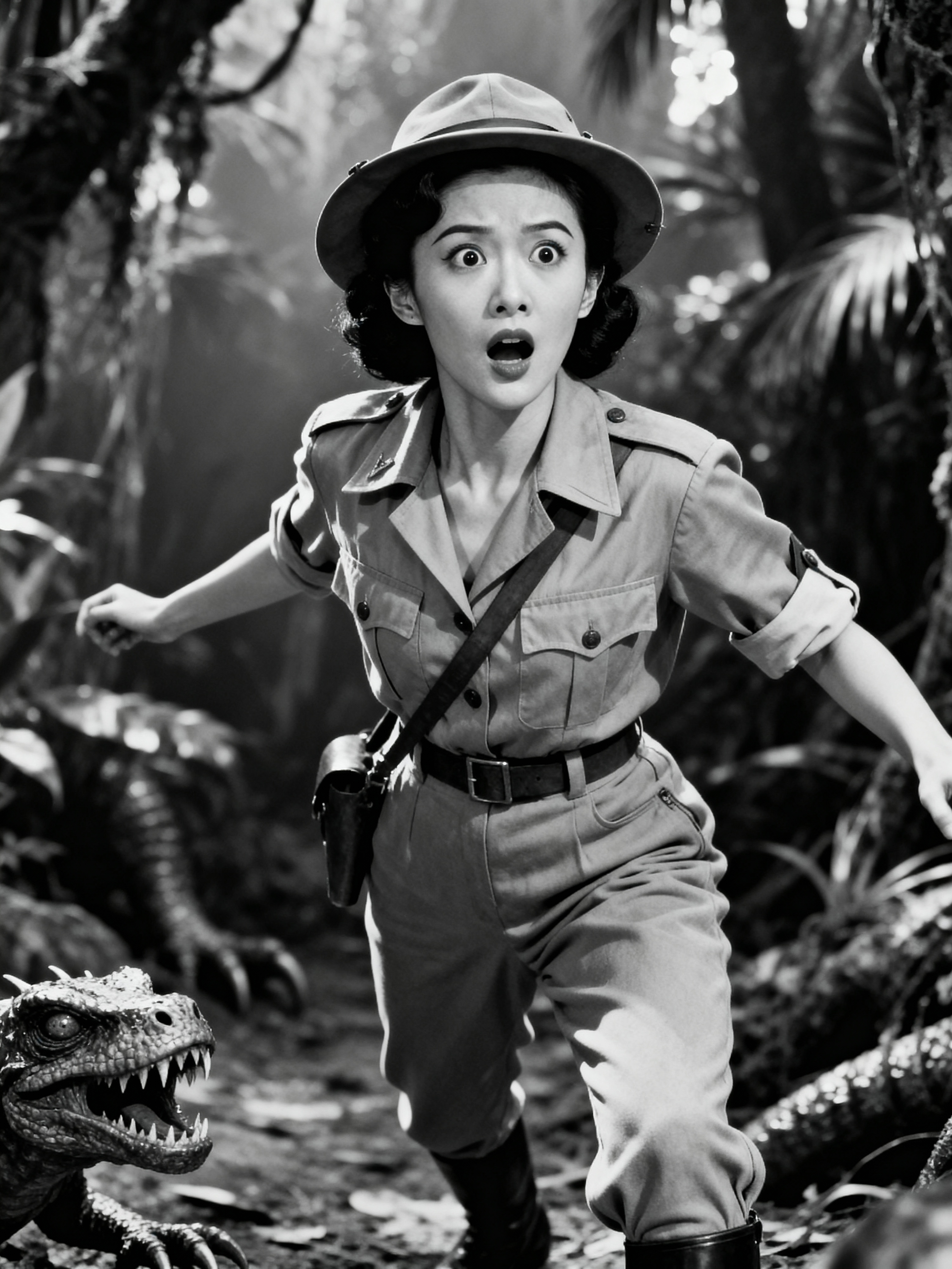 black and white 35mm film of model as a 1920s silent film adventuress in the style of early serials, wearing a safari outfit with jodhpurs, dramatic surprised expression , action pose, high-contrast black and white, jungle set with prop dangers