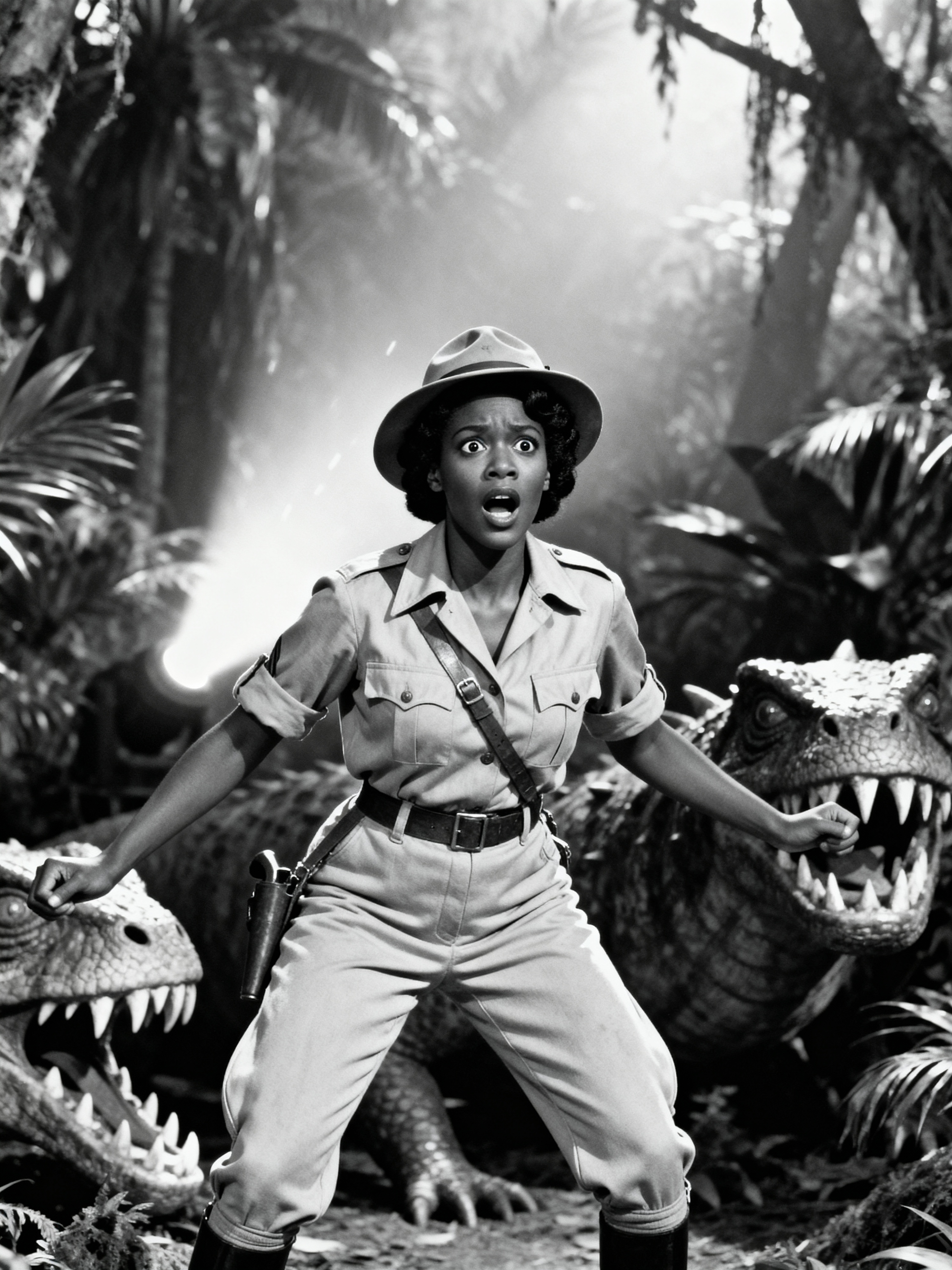 black and white 35mm film of model as a 1920s silent film adventuress in the style of early serials, wearing a safari outfit with jodhpurs, dramatic surprised expression , action pose, high-contrast black and white, jungle set with prop dangers