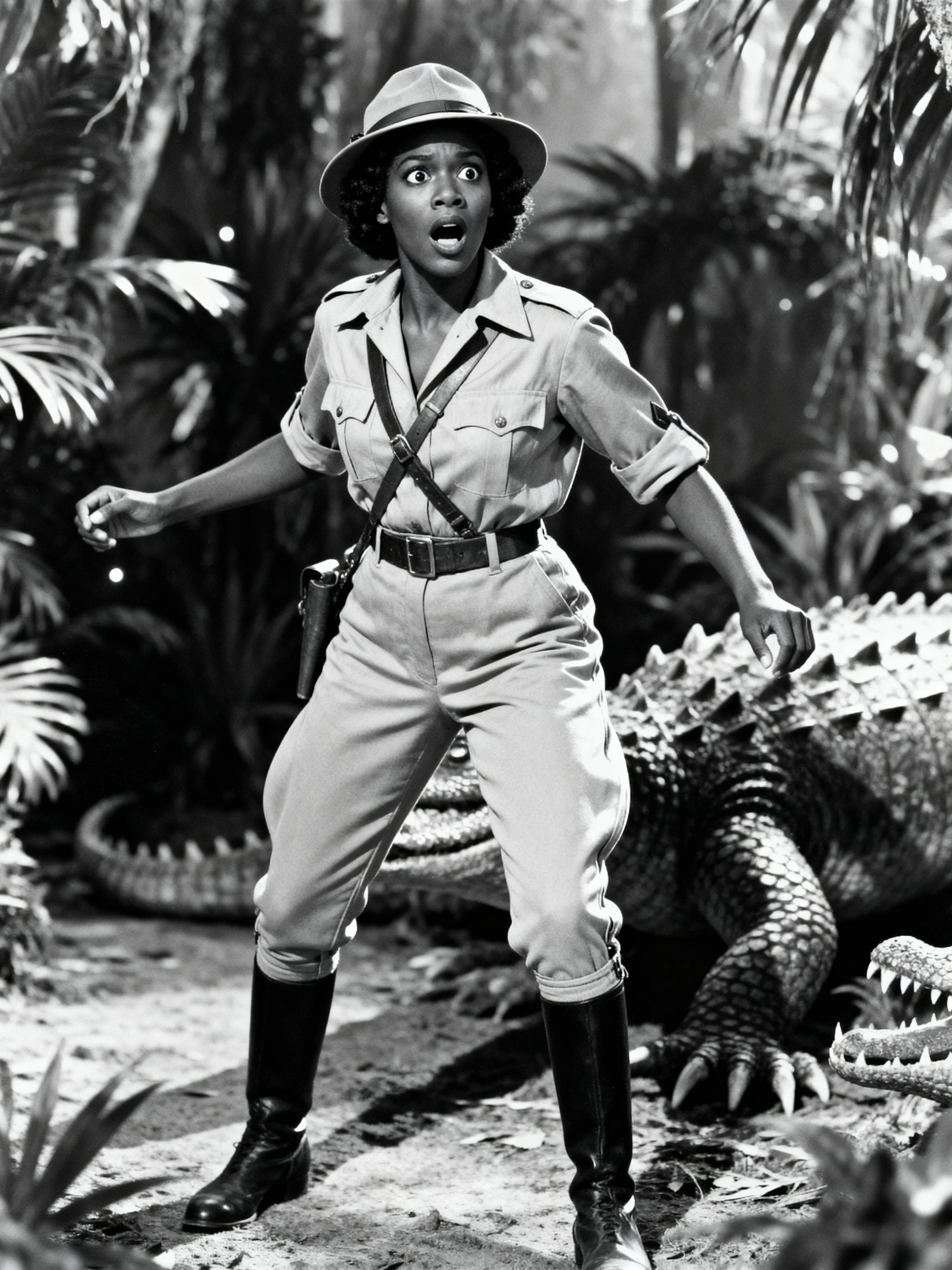 black and white 35mm film of model as a 1920s silent film adventuress in the style of early serials, wearing a safari outfit with jodhpurs, dramatic surprised expression , action pose, high-contrast black and white, jungle set with prop dangers