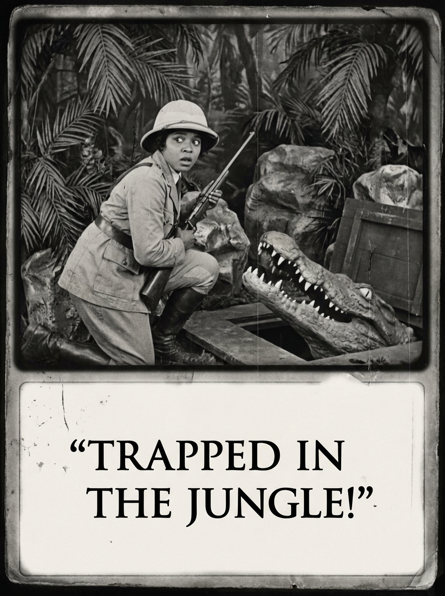 black and white 35mm film of model as a 1920s silent film adventuress in the style of early serials, wearing a safari outfit with jodhpurs, dramatic surprised expression , action pose, high-contrast black and white, jungle set with prop dangers