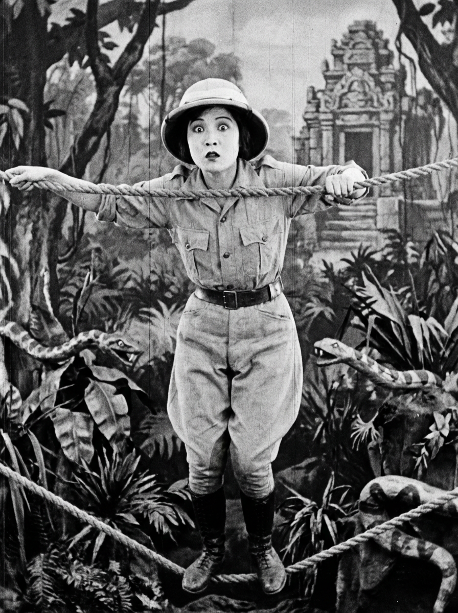black and white 35mm film of model as a 1920s silent film adventuress in the style of early serials, wearing a safari outfit with jodhpurs, dramatic surprised expression , action pose, high-contrast black and white, jungle set with prop dangers