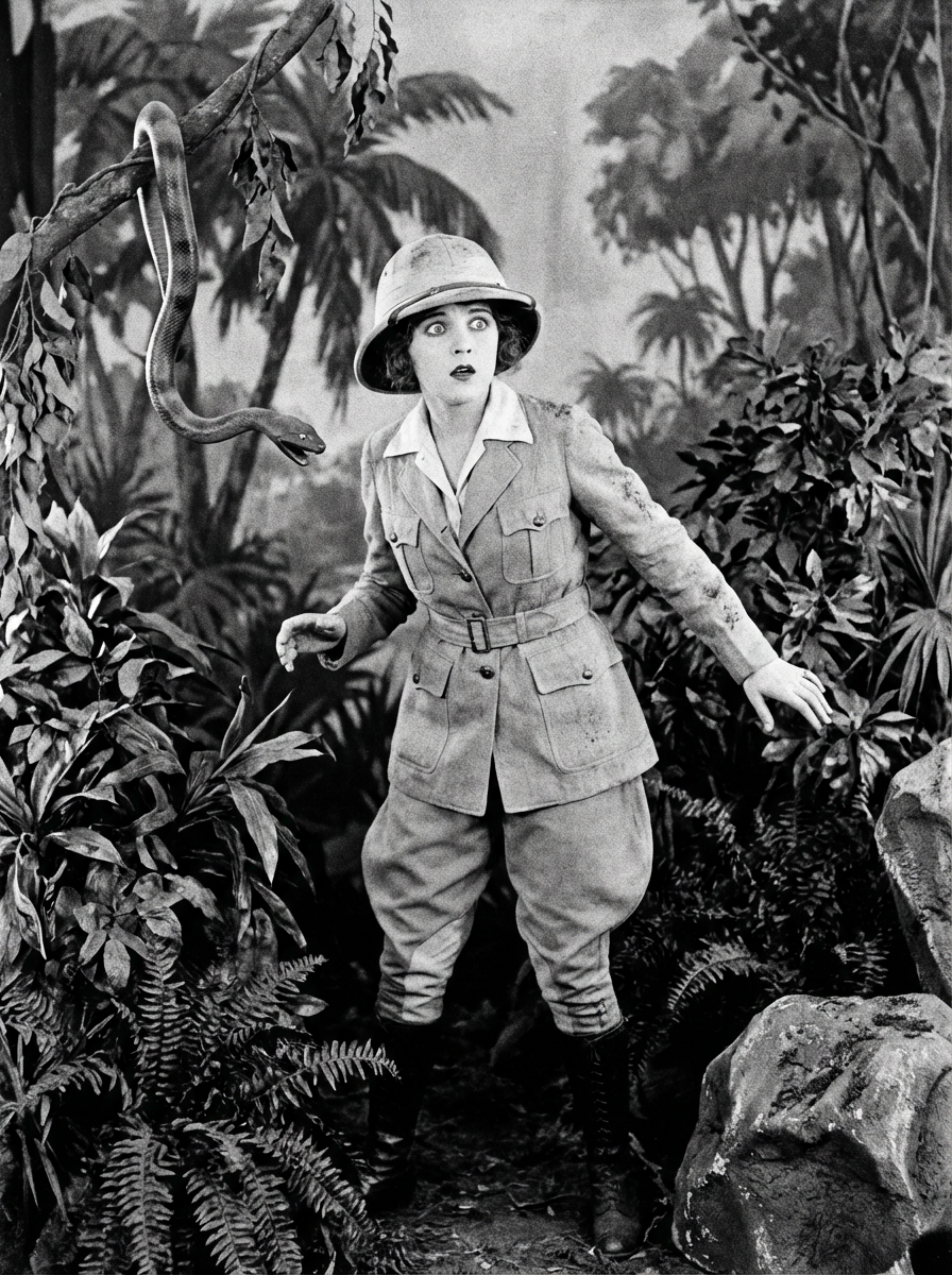 black and white 35mm film of model as a 1920s silent film adventuress in the style of early serials, wearing a safari outfit with jodhpurs, dramatic surprised expression , action pose, high-contrast black and white, jungle set with prop dangers
