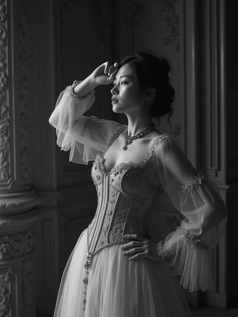 black and white 35mm film of model as a 1920s silent film aristocrat in distress, wearing an elaborate Victorian dress with corset, fainting dramatically with hand to forehead , theatrical staging, black and white with flickering film effect, opulent mansion interior