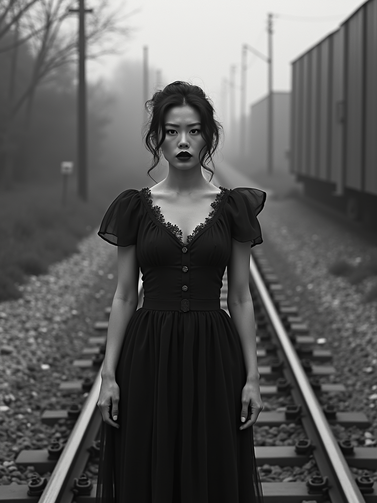 black and white 35mm film of model as a 1920s silent film damsel on railroad tracks, wearing a Victorian-inspired dress, exaggerated fearful expression , melodramatic pose, vignette effect, black and white with silent film aesthetic, title card nearby
