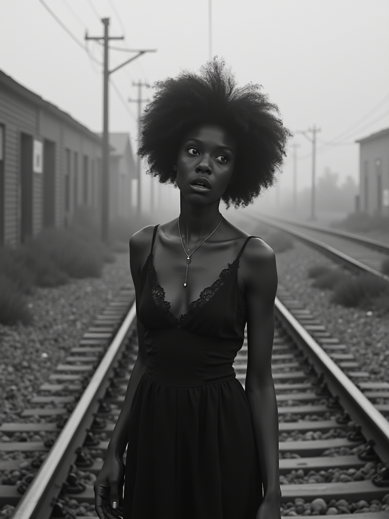 black and white 35mm film of model as a 1920s silent film damsel on railroad tracks, wearing a Victorian-inspired dress, exaggerated fearful expression , melodramatic pose, vignette effect, black and white with silent film aesthetic, title card nearby