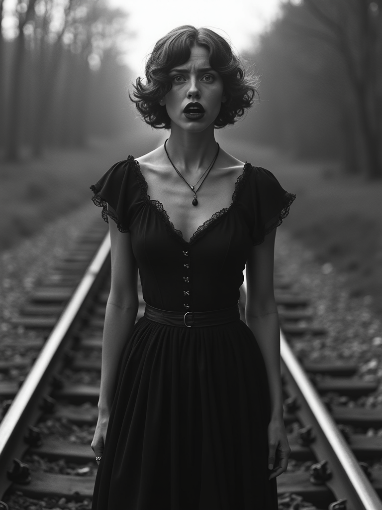 black and white 35mm film of model as a 1920s silent film damsel on railroad tracks, wearing a Victorian-inspired dress, exaggerated fearful expression , melodramatic pose, vignette effect, black and white with silent film aesthetic, title card nearby