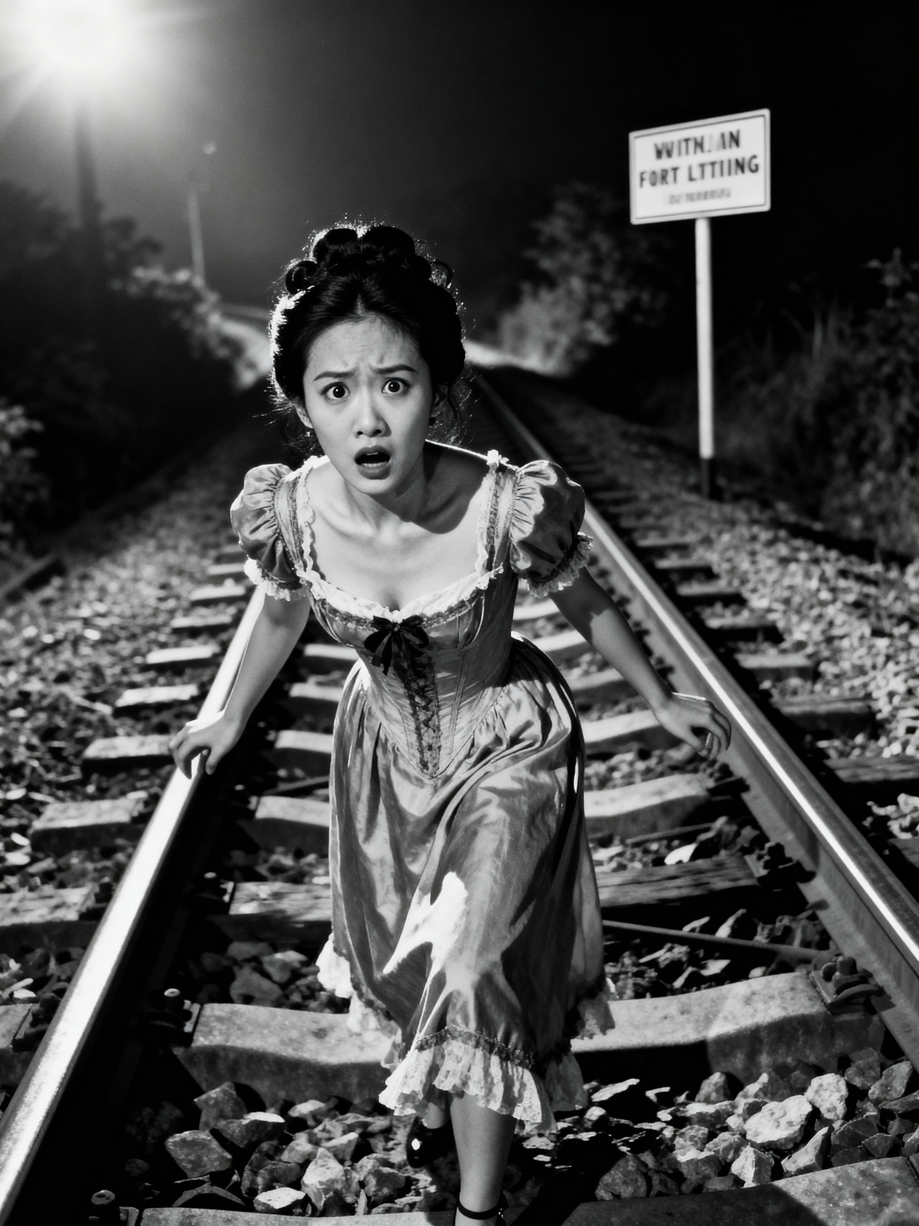 black and white 35mm film of model as a 1920s silent film damsel on railroad tracks, wearing a Victorian-inspired dress, exaggerated fearful expression , melodramatic pose, vignette effect, black and white with silent film aesthetic, title card nearby
