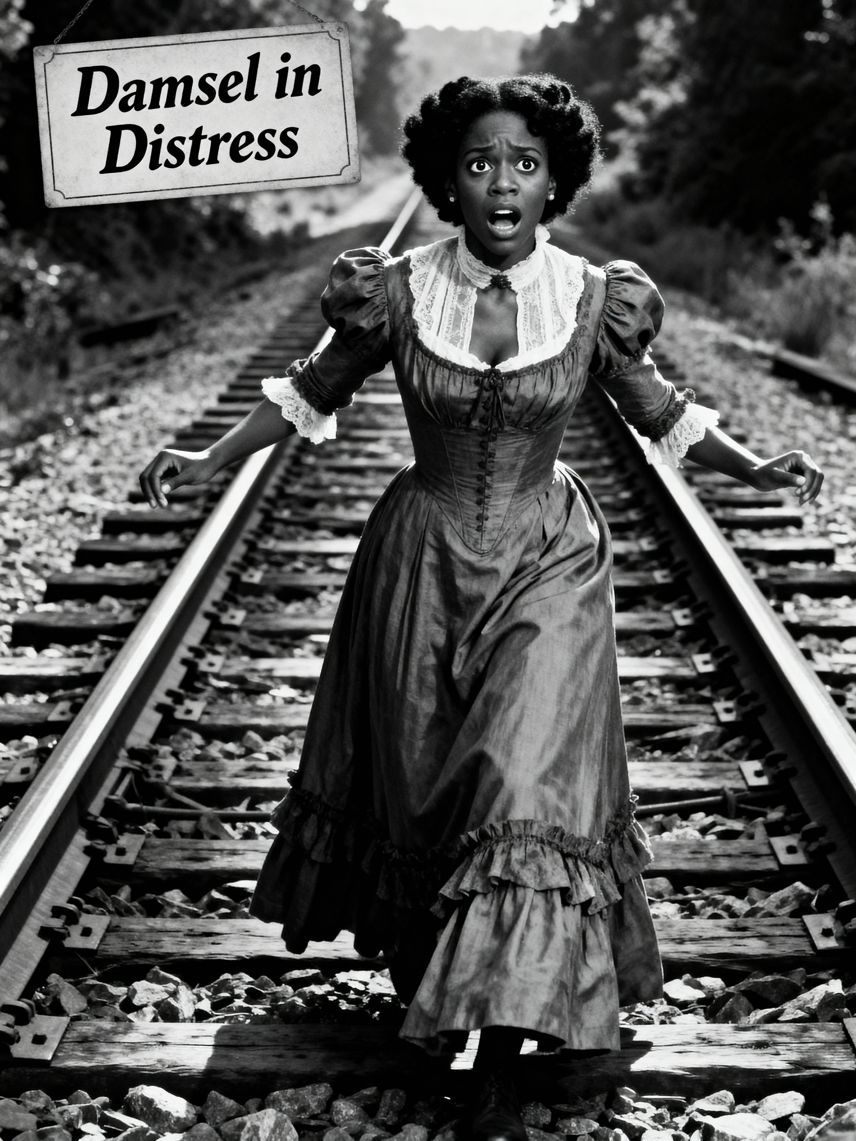 black and white 35mm film of model as a 1920s silent film damsel on railroad tracks, wearing a Victorian-inspired dress, exaggerated fearful expression , melodramatic pose, vignette effect, black and white with silent film aesthetic, title card nearby