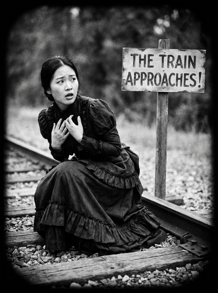 black and white 35mm film of model as a 1920s silent film damsel on railroad tracks, wearing a Victorian-inspired dress, exaggerated fearful expression , melodramatic pose, vignette effect, black and white with silent film aesthetic, title card nearby
