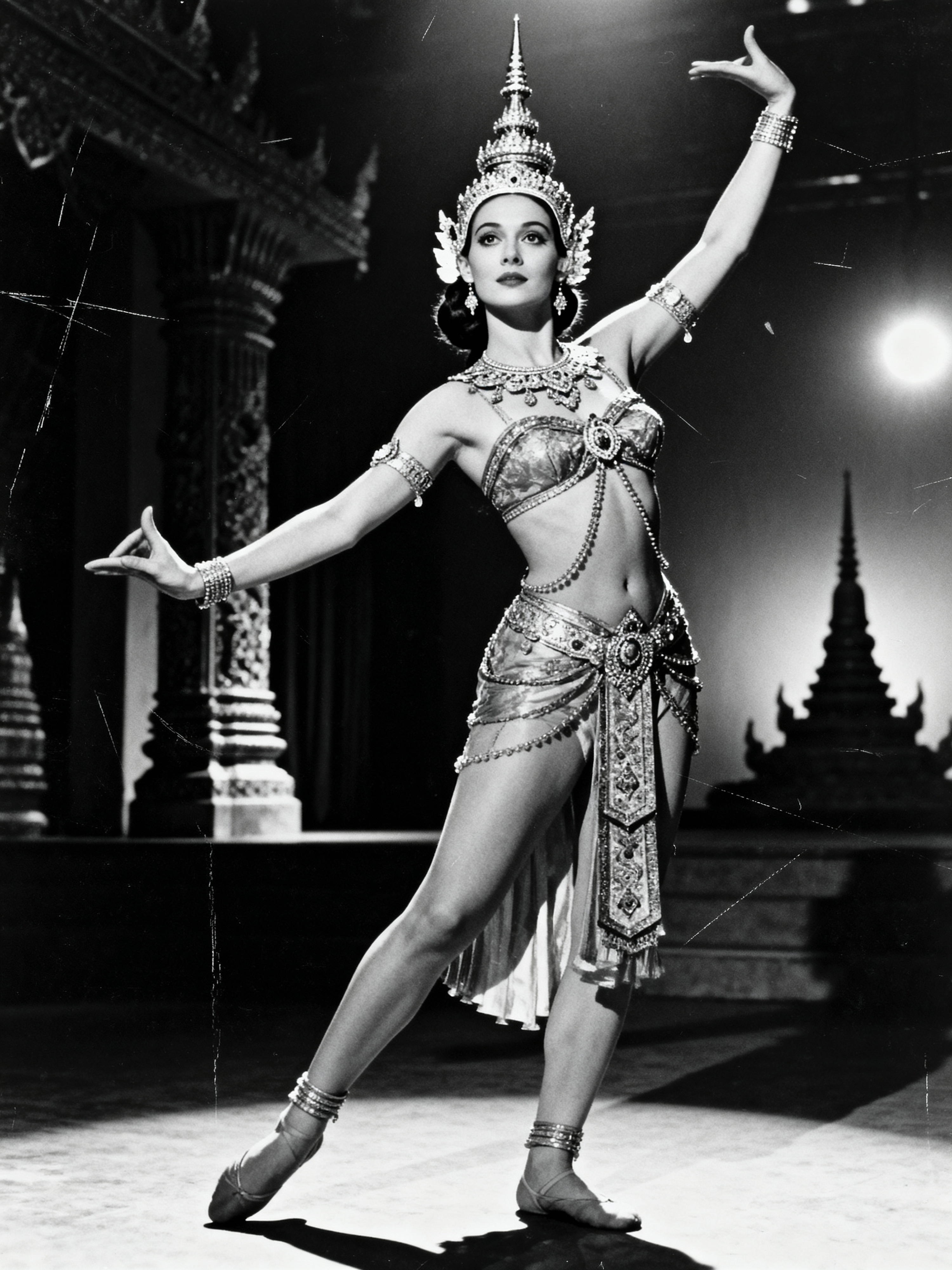 black and white 35mm film of model as a 1920s silent film dancer in an exotic costume, performing an interpretive dance, exaggerated graceful pose , theatrical lighting, black and white with vintage film scratches, elaborate temple set design