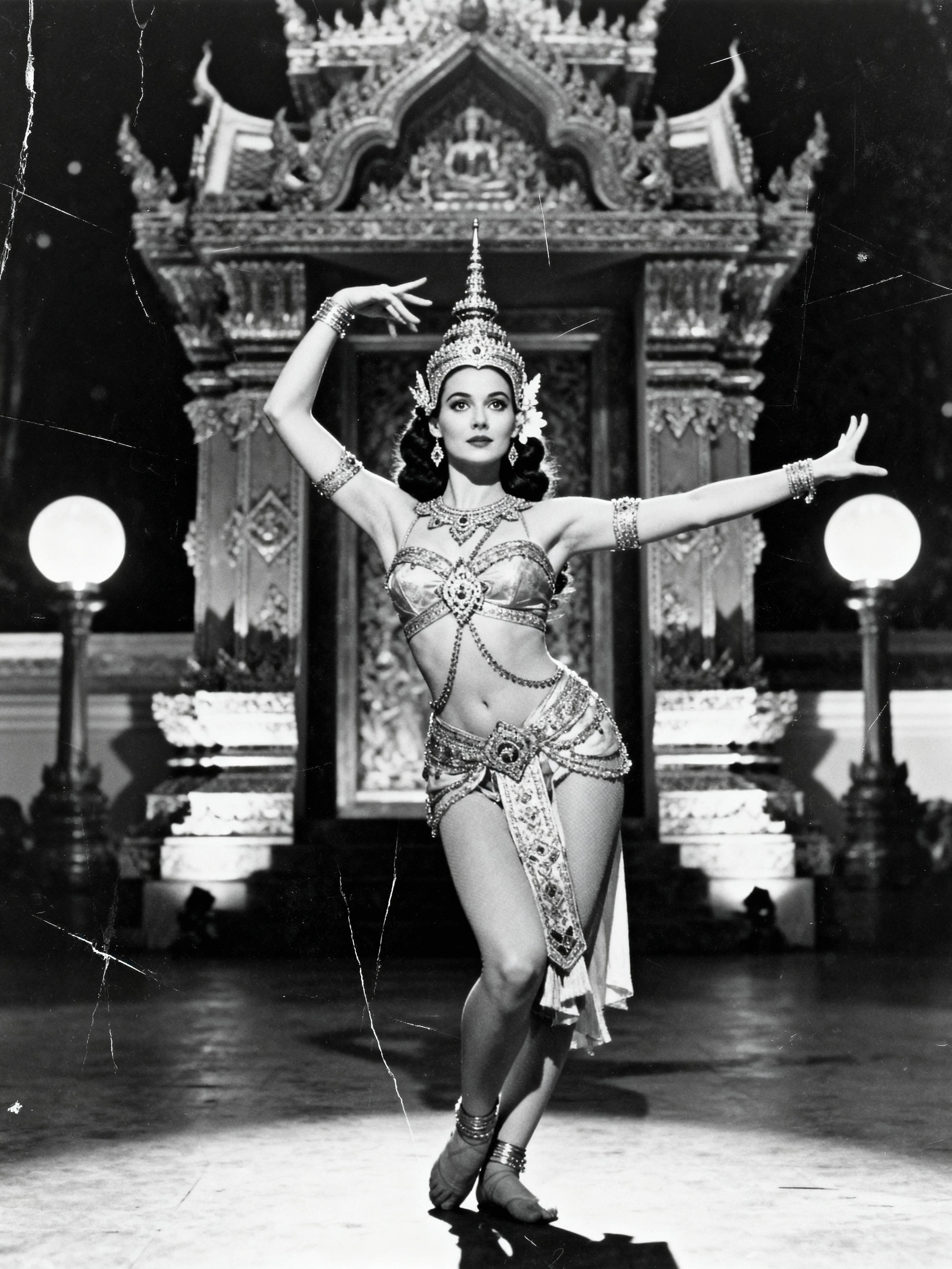 black and white 35mm film of model as a 1920s silent film dancer in an exotic costume, performing an interpretive dance, exaggerated graceful pose , theatrical lighting, black and white with vintage film scratches, elaborate temple set design
