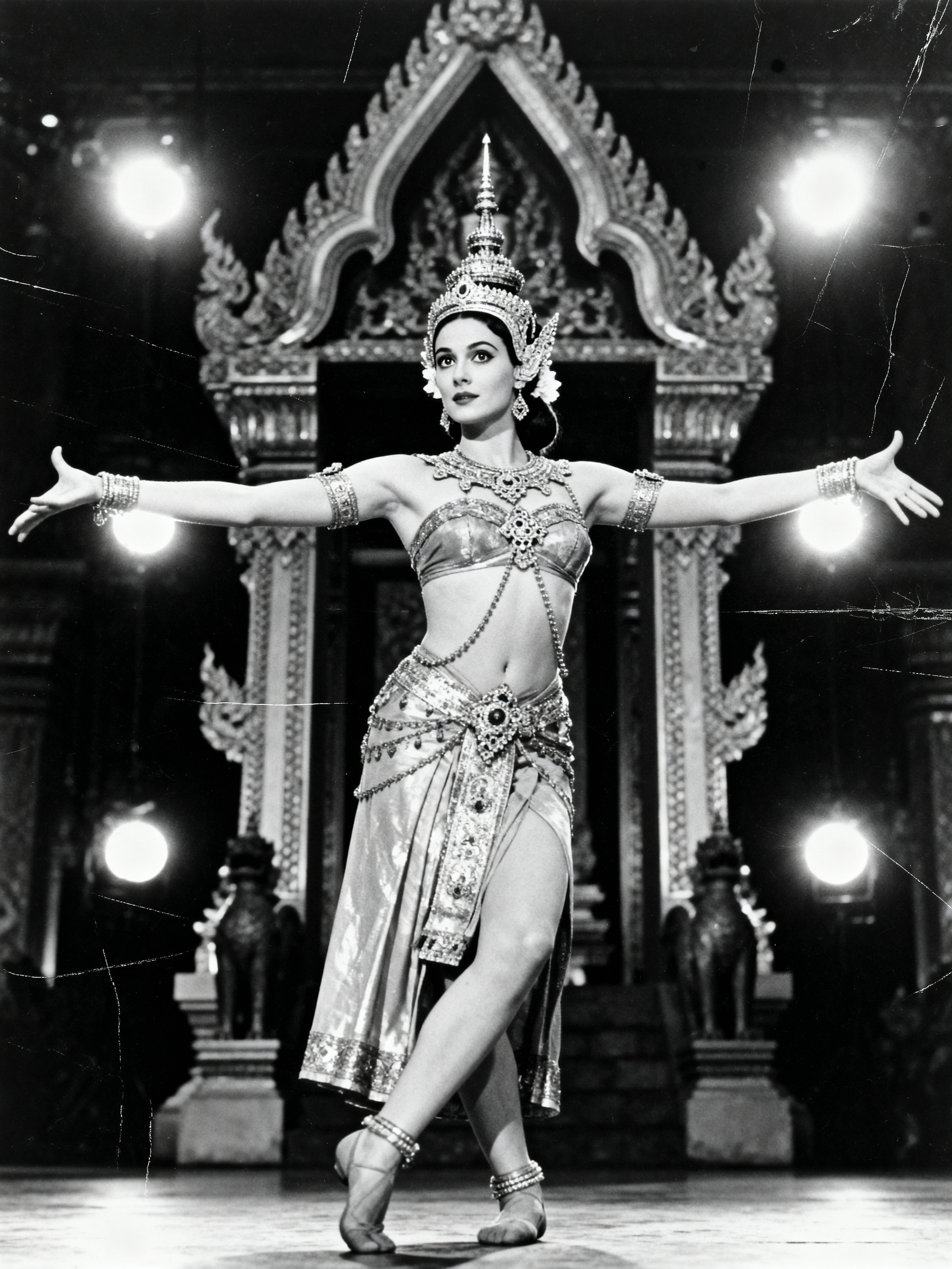 black and white 35mm film of model as a 1920s silent film dancer in an exotic costume, performing an interpretive dance, exaggerated graceful pose , theatrical lighting, black and white with vintage film scratches, elaborate temple set design